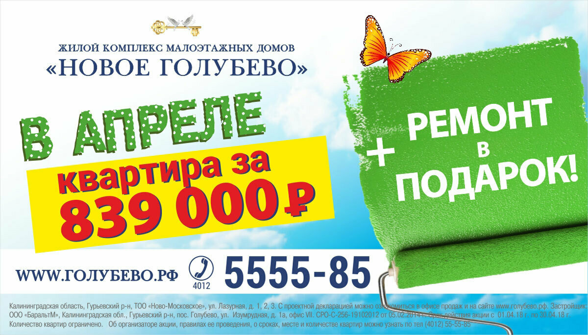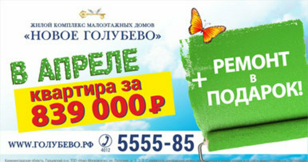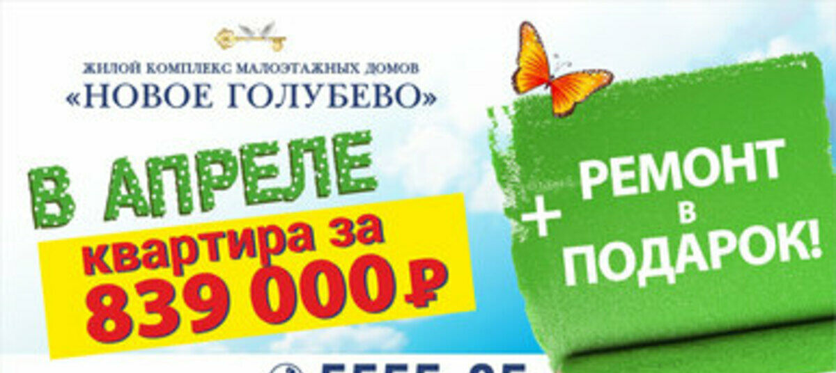 Только в апреле у вас есть шанс купить квартиру в ЖК "Новое Голубево" всего за 839 000 рублей да ещё и получить к ней в подарок абсолютно бесплатный ремонт!