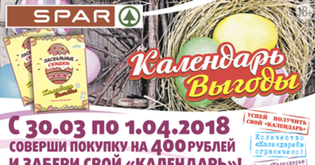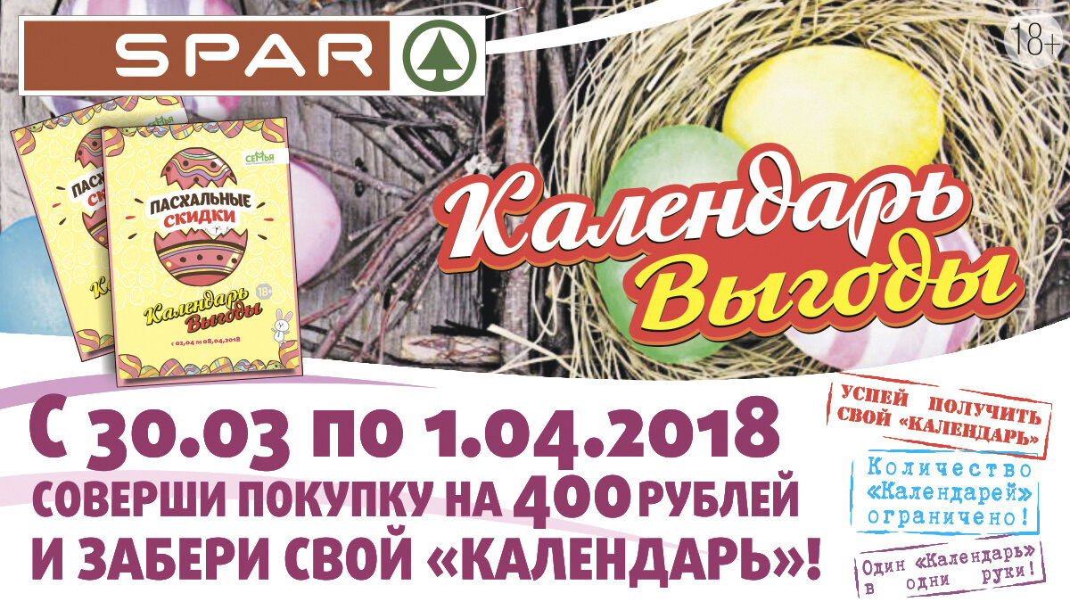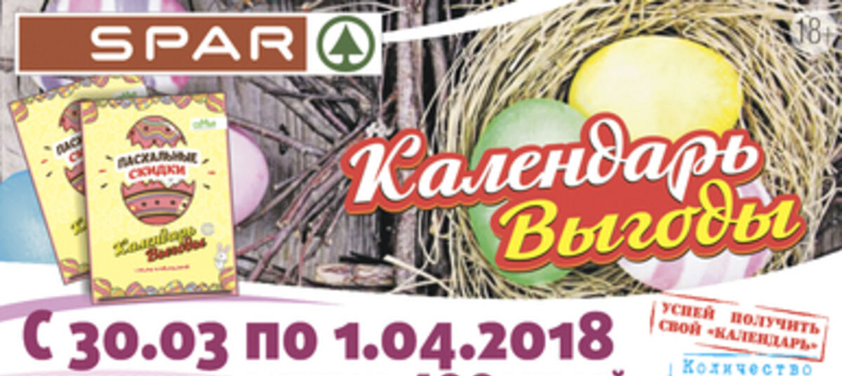 * "Календарь выгоды" выдаётся с 30 марта по 1 апреля 2018 года на кассах супермаркетов SPAR при единовременной покупке на сумму свыше 400 рублей. Количество календарей строго ограниченно. Информацию об организаторе акции, правилах её проведения, количестве товаров по специальной цене, сроках, месте и порядке их приобретения вы можете получить в магазинах SPAR и на сайте www.spar-kaliningrad.ru.