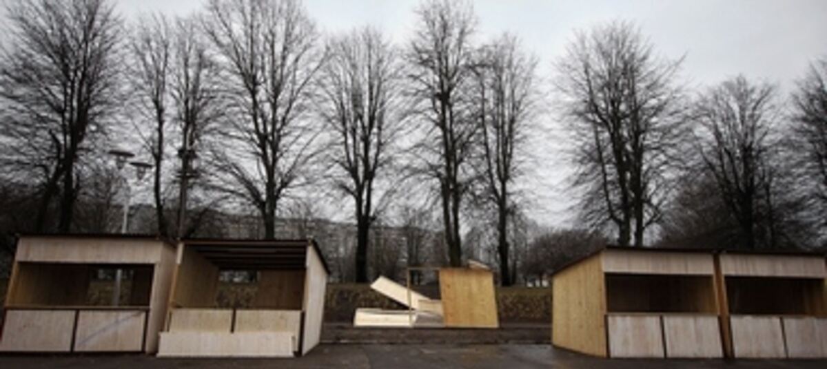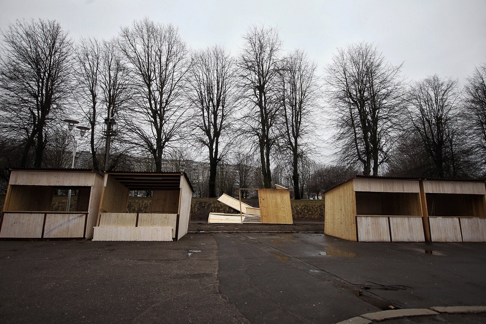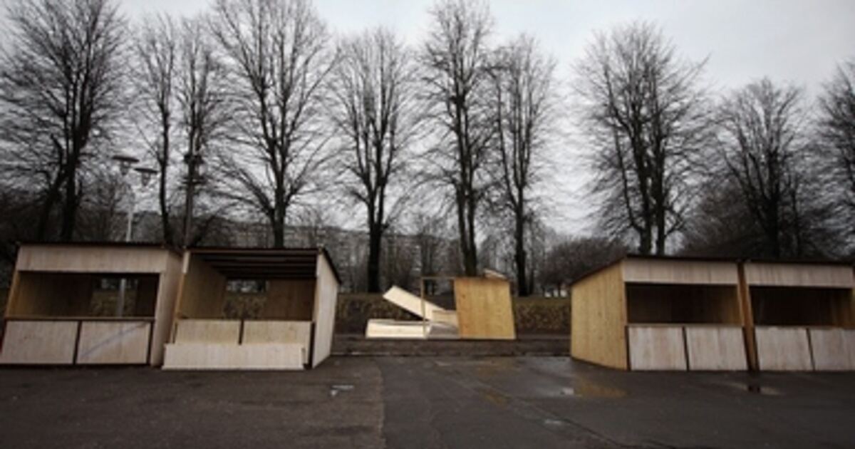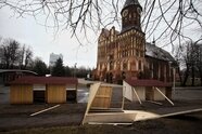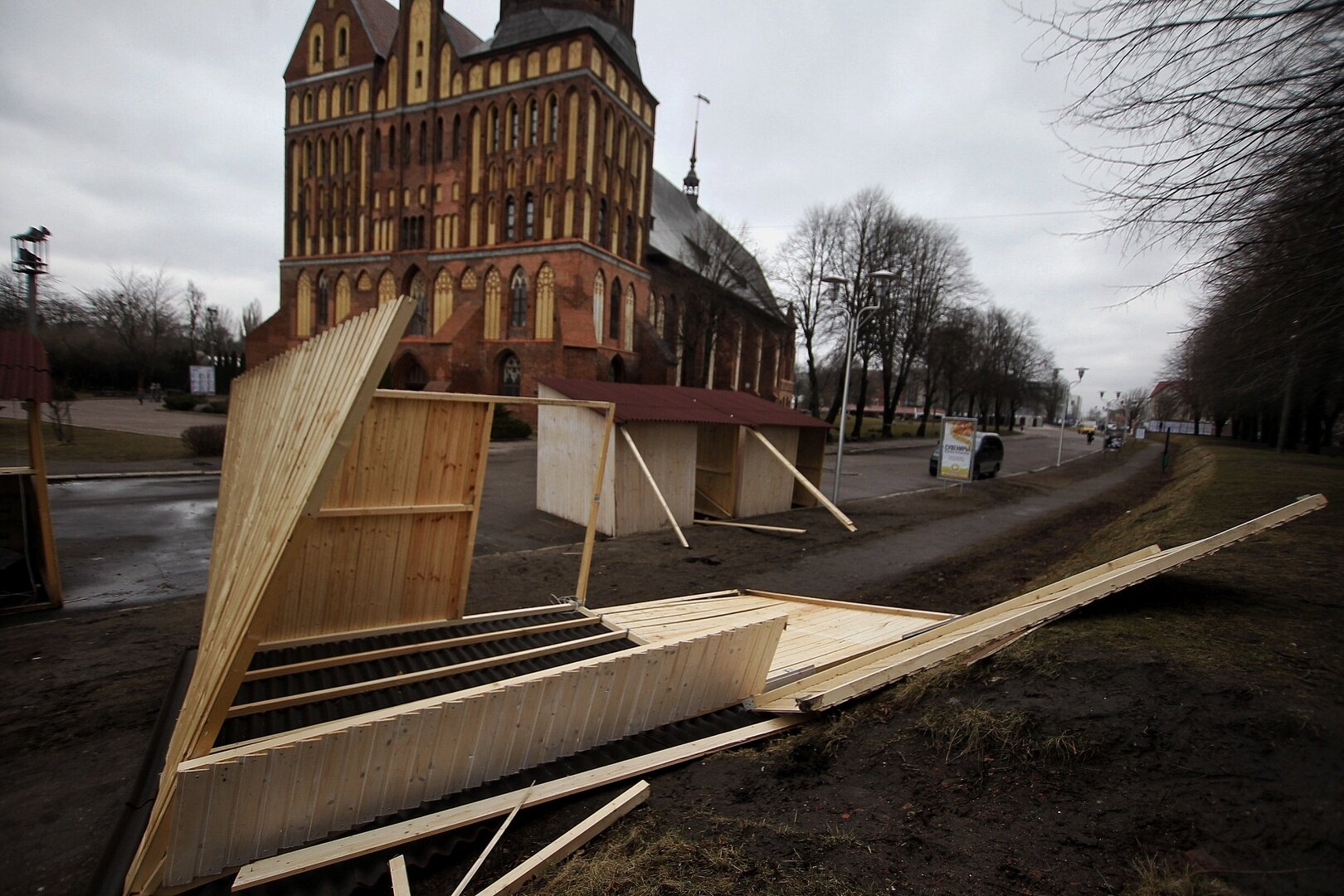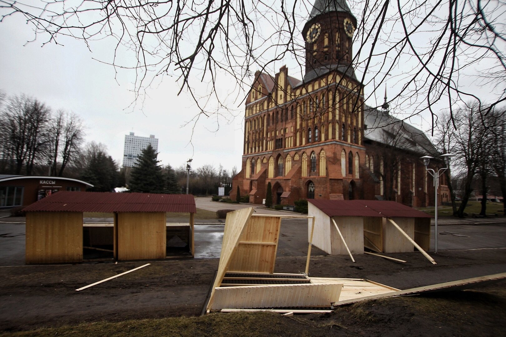 Шквалистый ветер в Калининграде сломал торговые объекты на острове Канта. Конструкции использовали во время ярмарки у Кафедрального собора.
