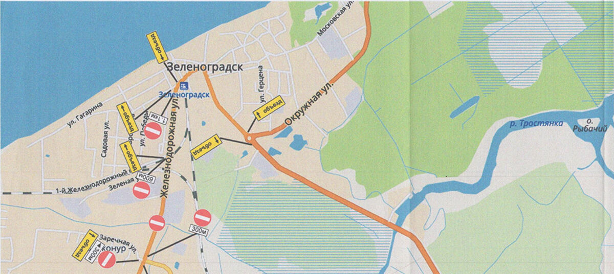 Для автомобилистов и общественного транспорта будет организован объезд по маршруту: Зеленоградск – пос. Вишневое – пос. Сосновка – Зеленоградск.