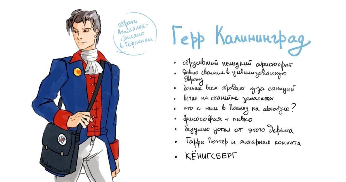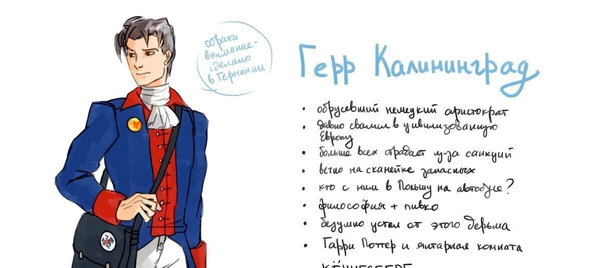 Сначала Екатерина опубликовала рисунки столиц и своего города. Пользователи Twitter заинтересовались ими и стали предлагать в комментариях новые идеи. В итоге количество изображений увеличилось до десяти. Калининград художница показала в образе обрусевшего немецкого аристократа, страдающего от санкций и пребывающего "вечно на скамейке запасных".