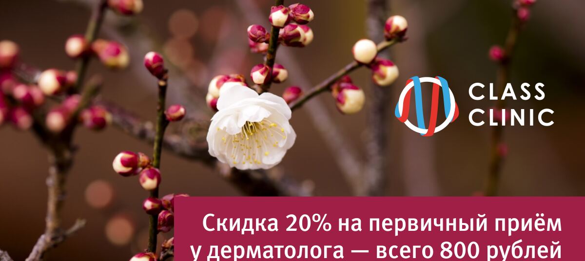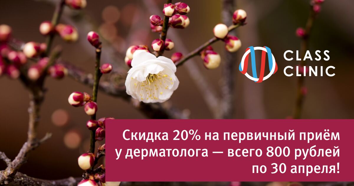 В медицинском центре Class Clinic в Калининграде по 30 апреля действует скидка 20% на приём и обследование в отделении дерматологии. Приём и консультация дерматолога стоят всего 800 рублей.