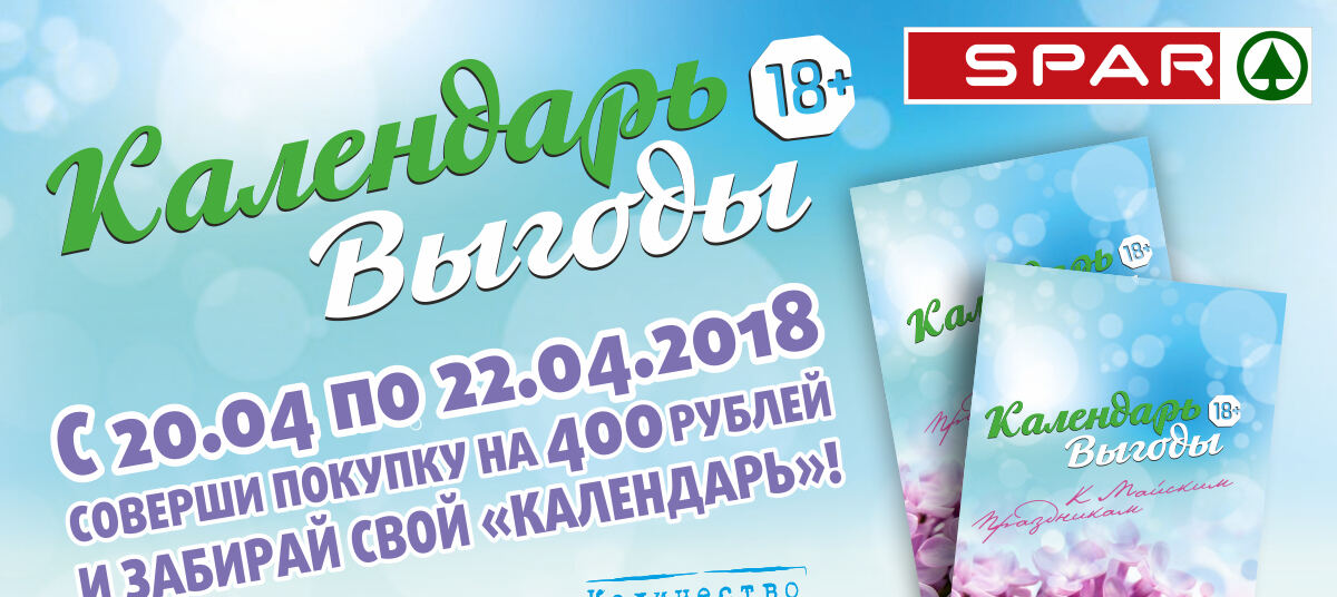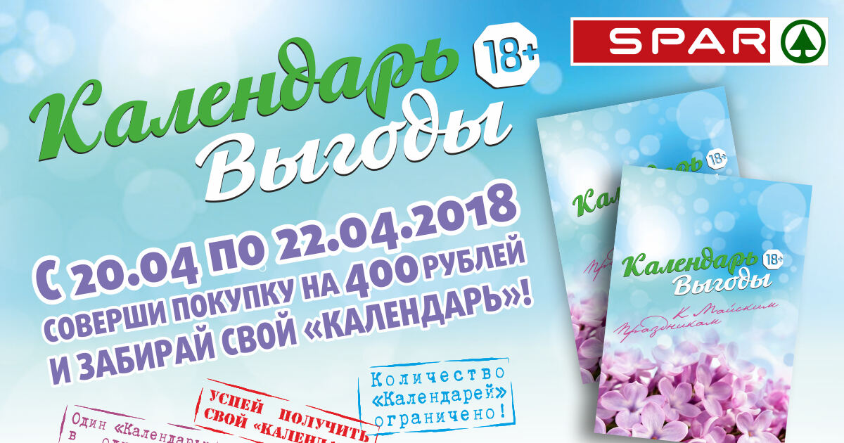 * "Календарь выгоды" выдаётся с 20 апреля по 22 апреля 2018 года на кассах супермаркетов SPAR при единовременной покупке на сумму свыше 400 рублей. Количество календарей строго ограниченно. Информацию об организаторе акции, правилах её проведения, количестве товаров по специальной цене, сроках, месте и порядке их приобретения вы можете получить в магазинах SPAR и на сайте www.spar-kaliningrad.ru.