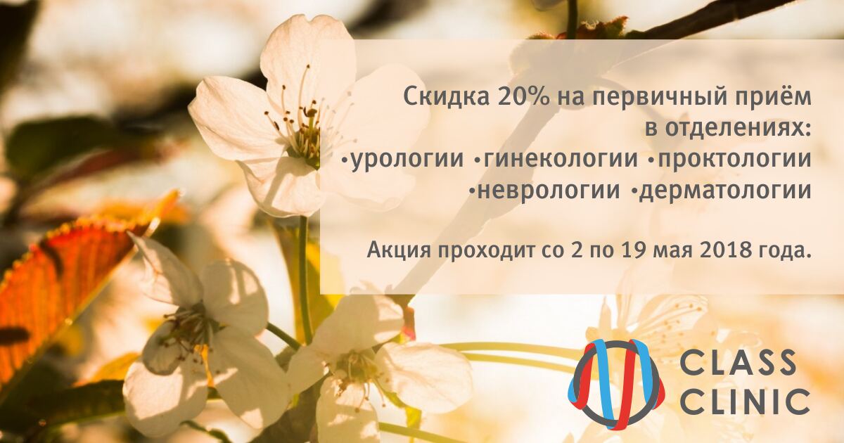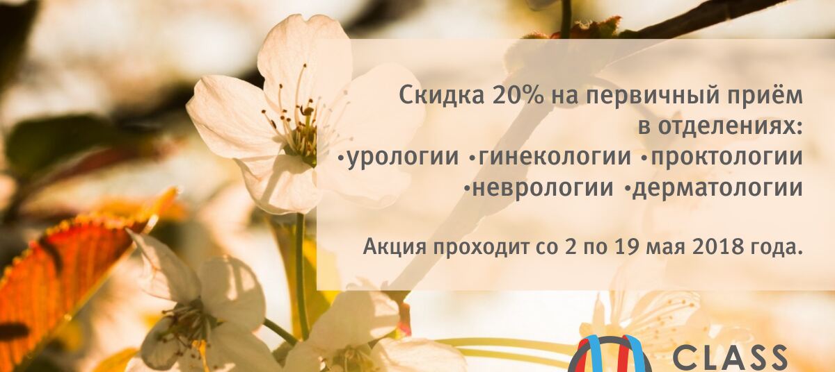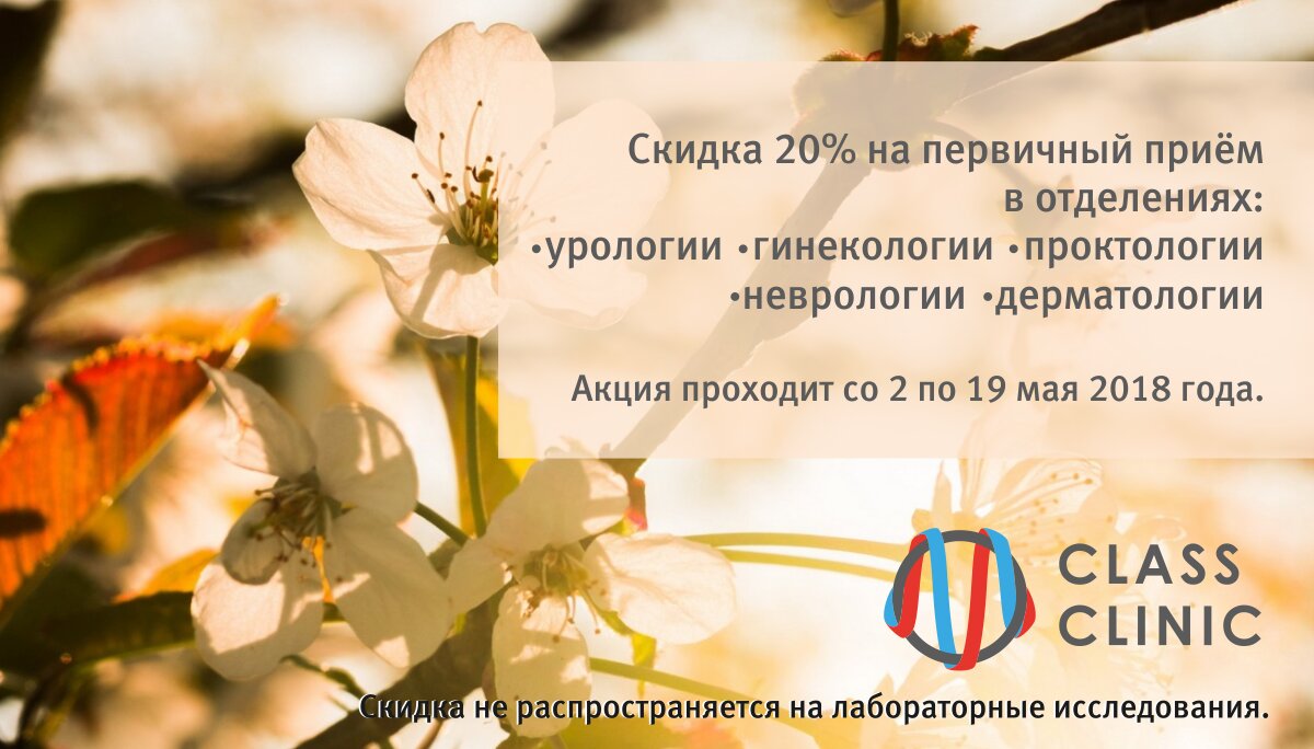 Со 2 по 19 мая при обращении в медцентр Class Clinic вы получаете скидку 20% на первичный приём и обследование в следующих отделениях: