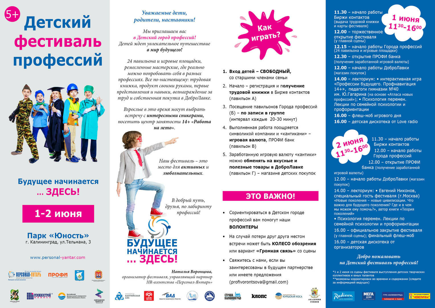 В 20 павильонах предприятий Калининградской области гости фестиваля познакомятся с различными профессиями и смогут попробовать себя в них. За трудовые успехи юные работники будут вознаграждены зарплатой в игровой валюте, которую можно будет обменять на вкусные и полезные товары в магазине детских покупок.