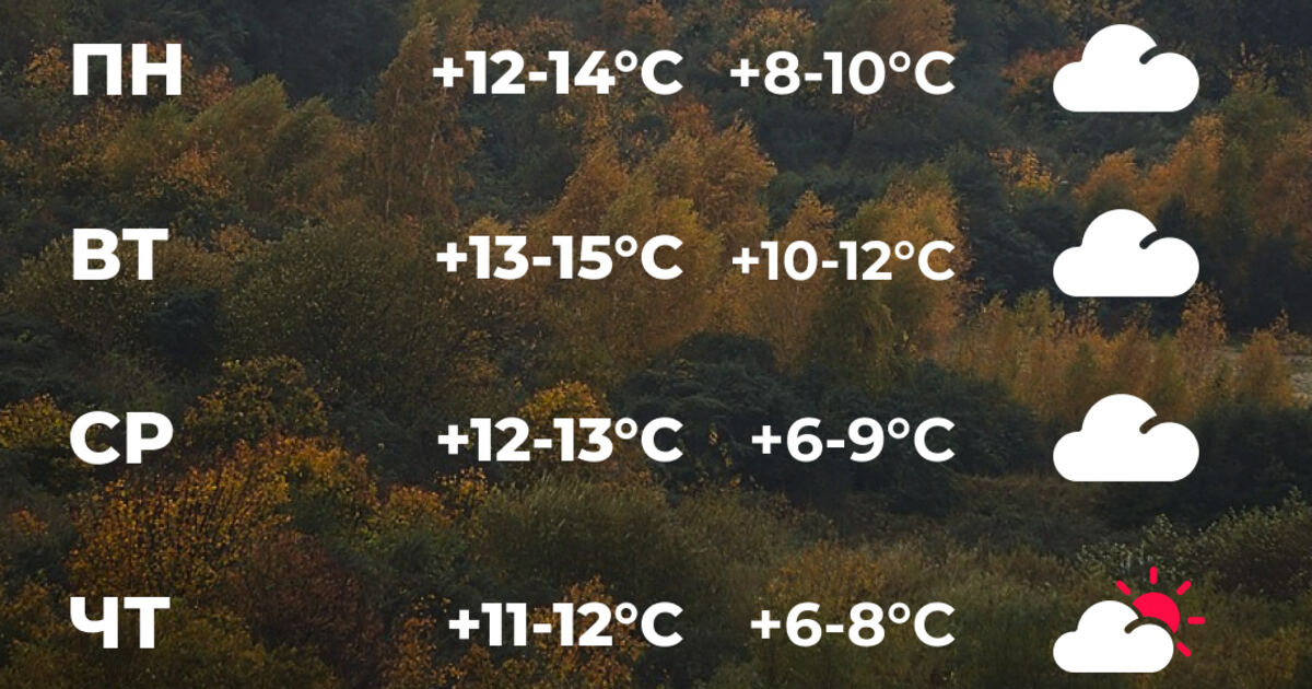В четверг днём — +11-12, облачно с прояснениями, дождь, ветер южный 4-6 м/с. В ночь на пятницу — +6-9.