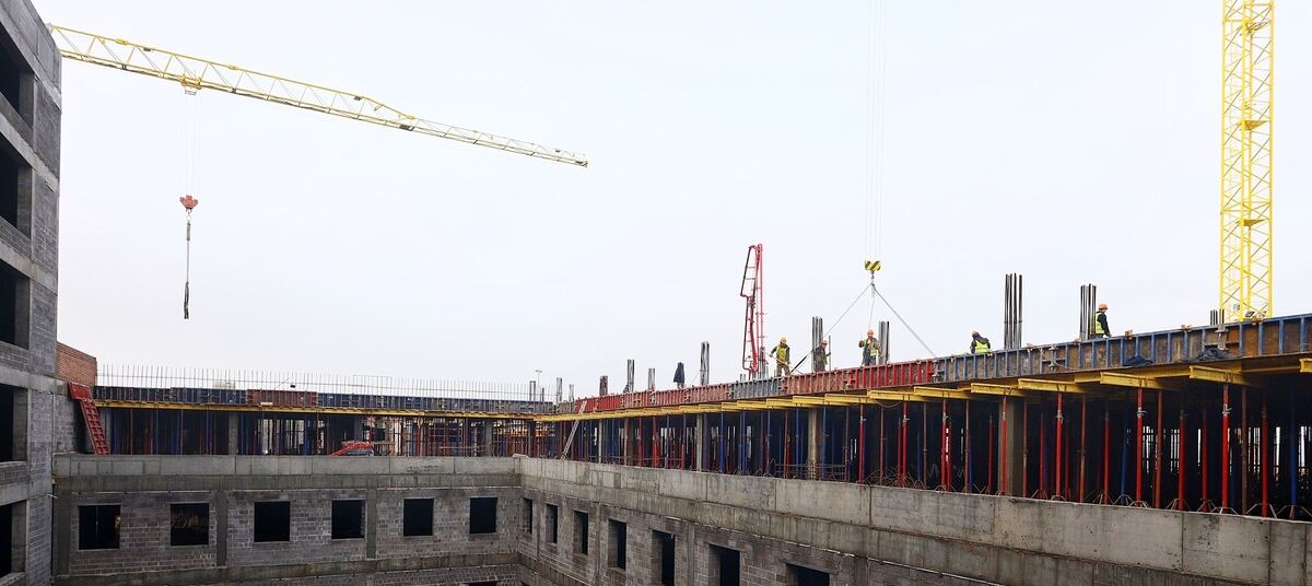 Плиту перекрытия залили в воскресенье, 15 ноября. Это последняя самая большая плита, её объём достигает 670 кубических метров. После неё зальют маленькую усечённой формы, что станет завершением в возведении монолитного каркаса в блоке. Как работали строители, смотрите здесь.