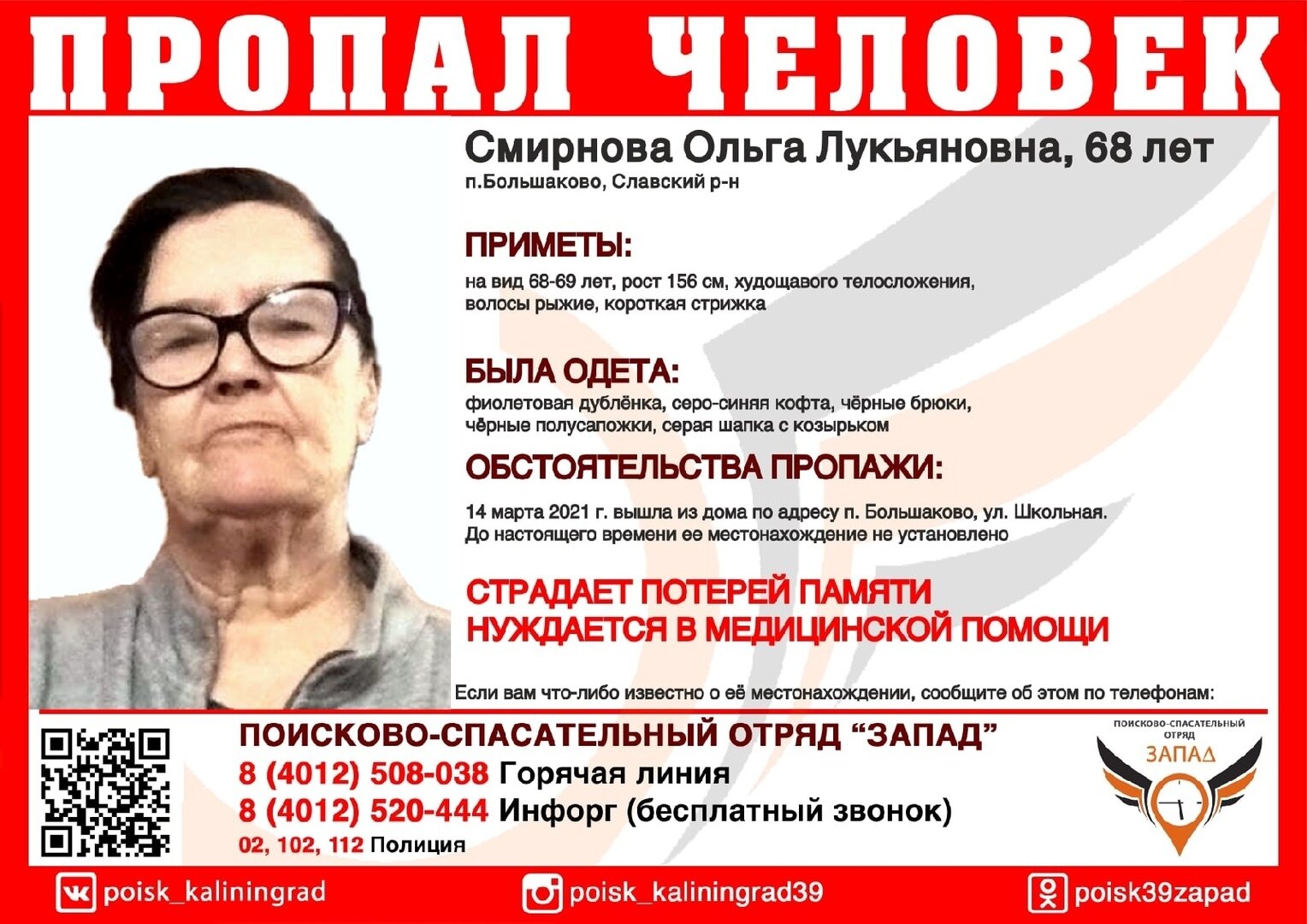 14 марта жительница посёлка Сосновка Полесского района Ольга Смирнова гостила у дочери в посёлке Большаково Славского района. Она собиралась домой, проехать до которого нужно было несколько остановок на автобусе. Но по какой-то причине женщина не села в автобус, а свернула в лес — это видел знакомый семьи Смирновых.