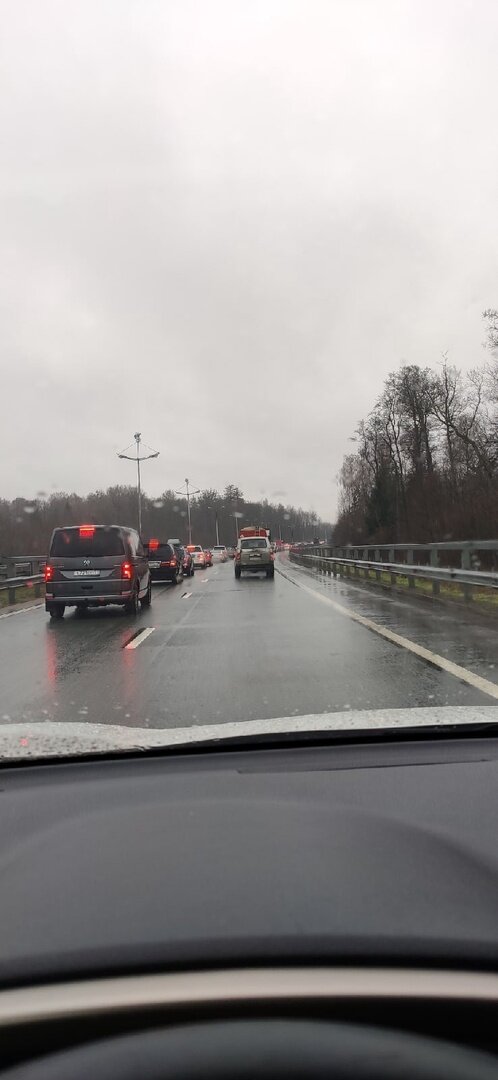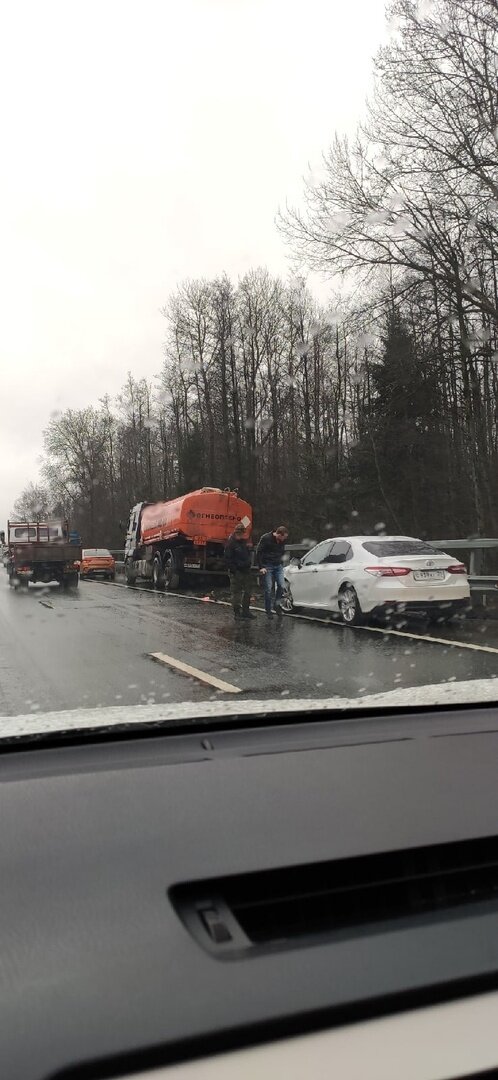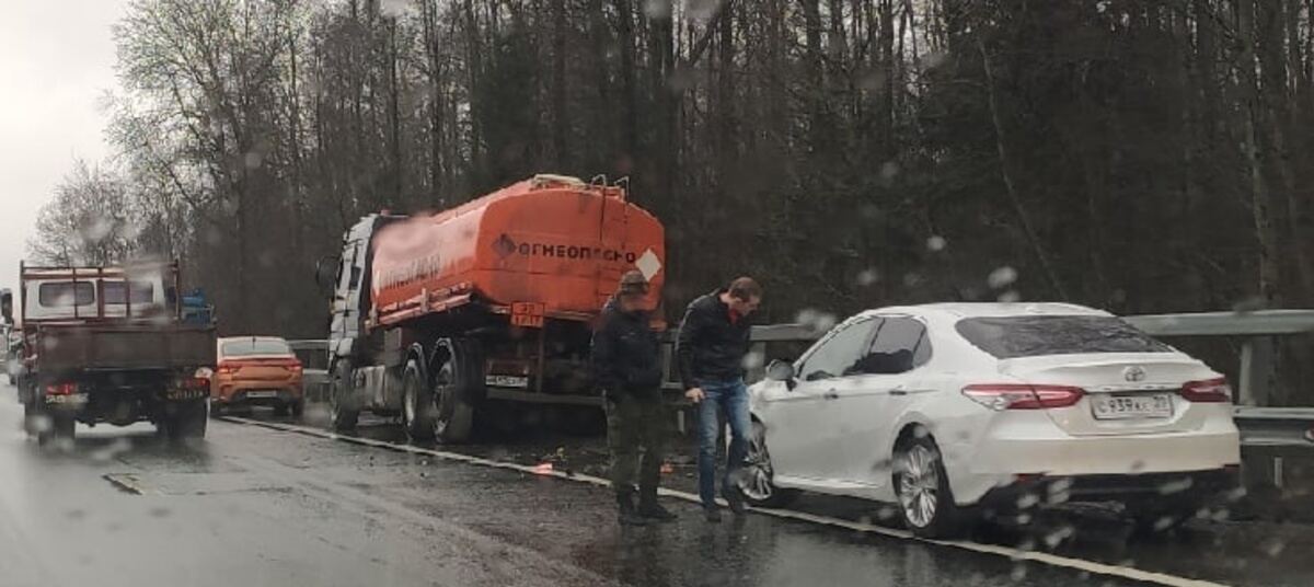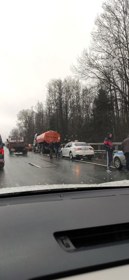 Авария произошла днём в среду, 9 февраля, на участке между аэропортом Храброво и городом. «Бензовоз и легковая машина стоят на обочине, и бензовоз чуть не завалился, судя по его виду», — рассказала Юлия.