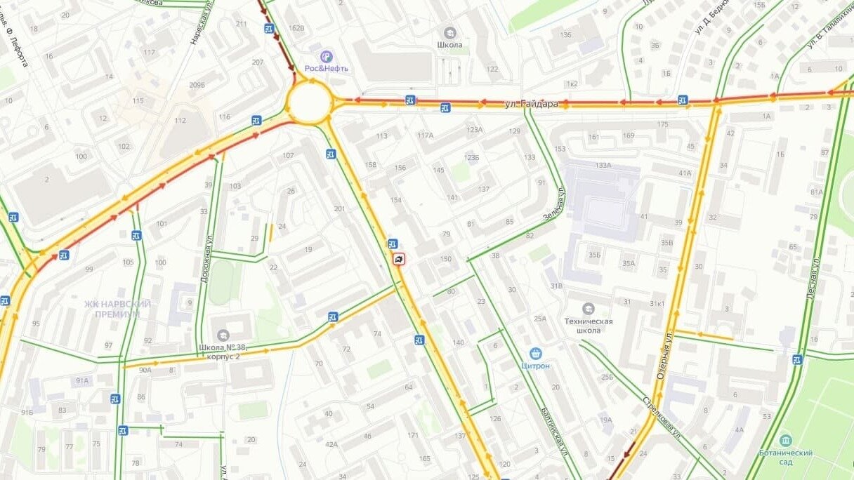 По данным сервиса «Яндекс.Карты», на Горького образовалась километровая пробка. Движение также затруднено на Гайдара.