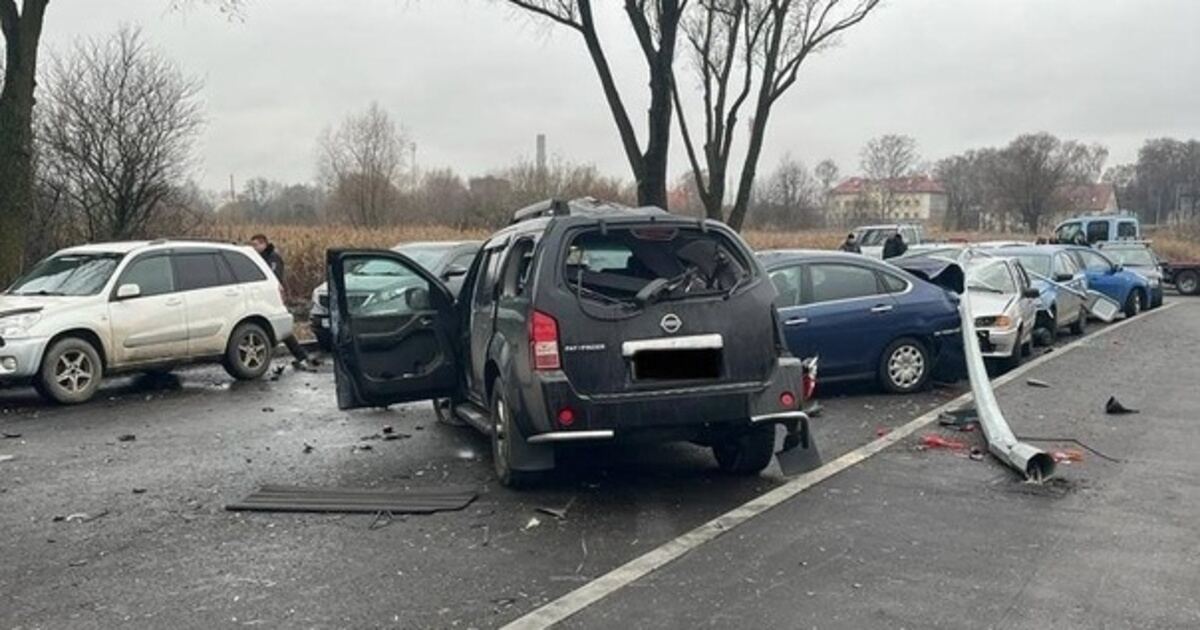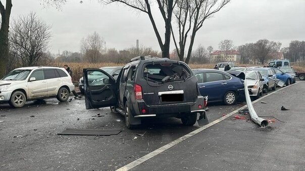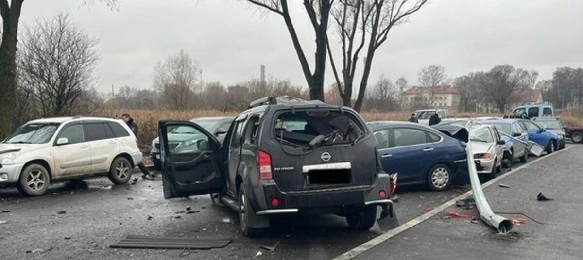 ДТП произошло утром в понедельник, 28 ноября. Сидевший за рулём Nissan мужчина не справился с управлением, врезался в фонарный столб и протаранил два Kia, Nissan, «Ладу» и Škoda, стоявшие вдоль проезжей части. Нарушитель получил травмы.