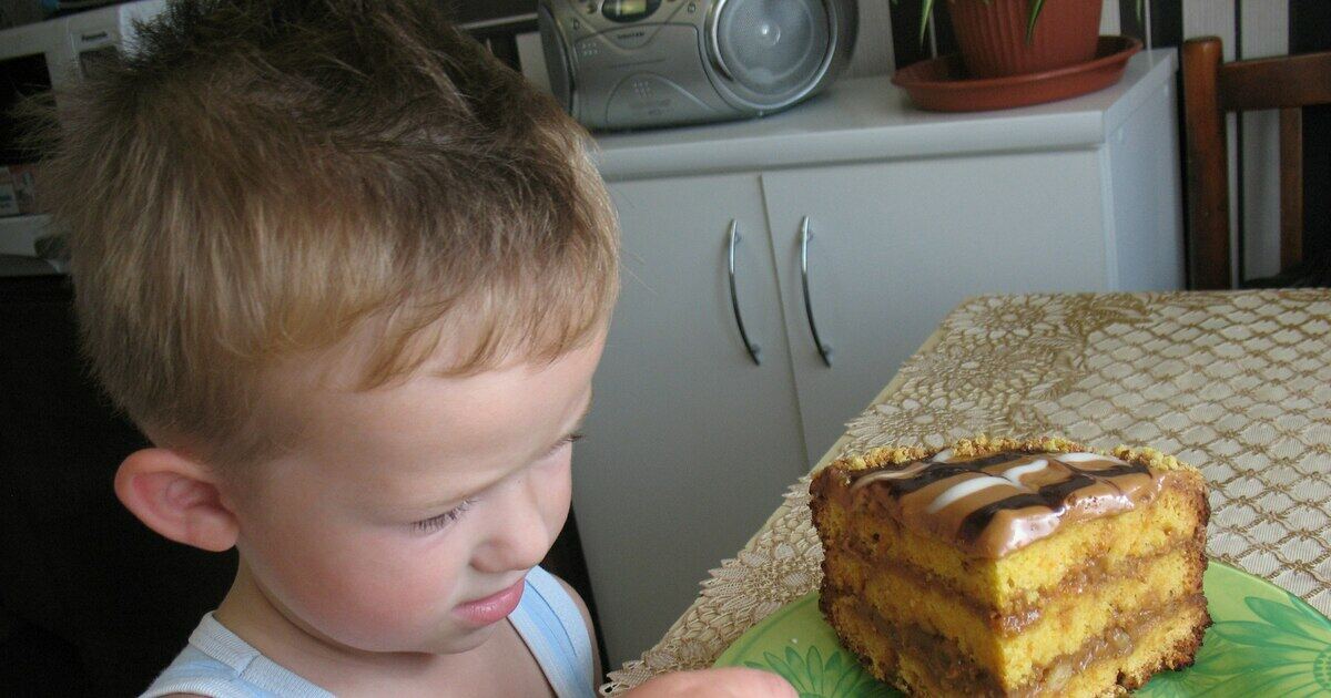 Поднявшуюся "горкой" верхушку - срезала (для присыпки). Промазала коржи кремом из вареной сгущенки и масла сливочного. Добавила и грецких орешков немного в крем.