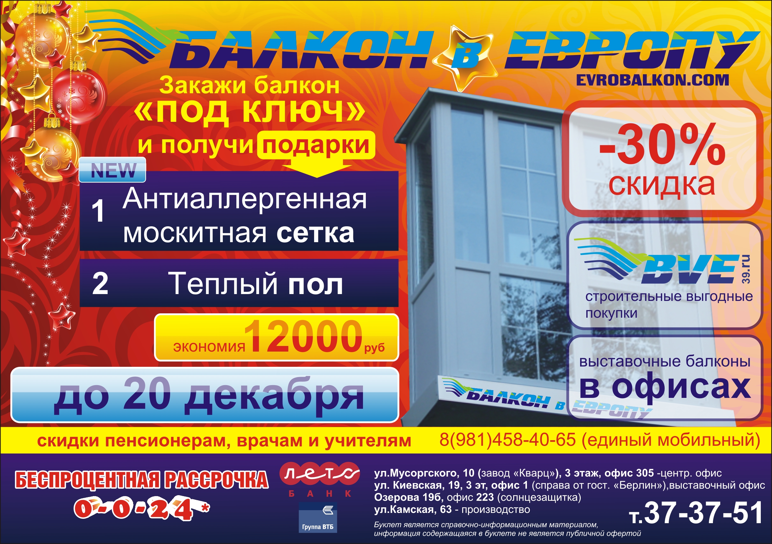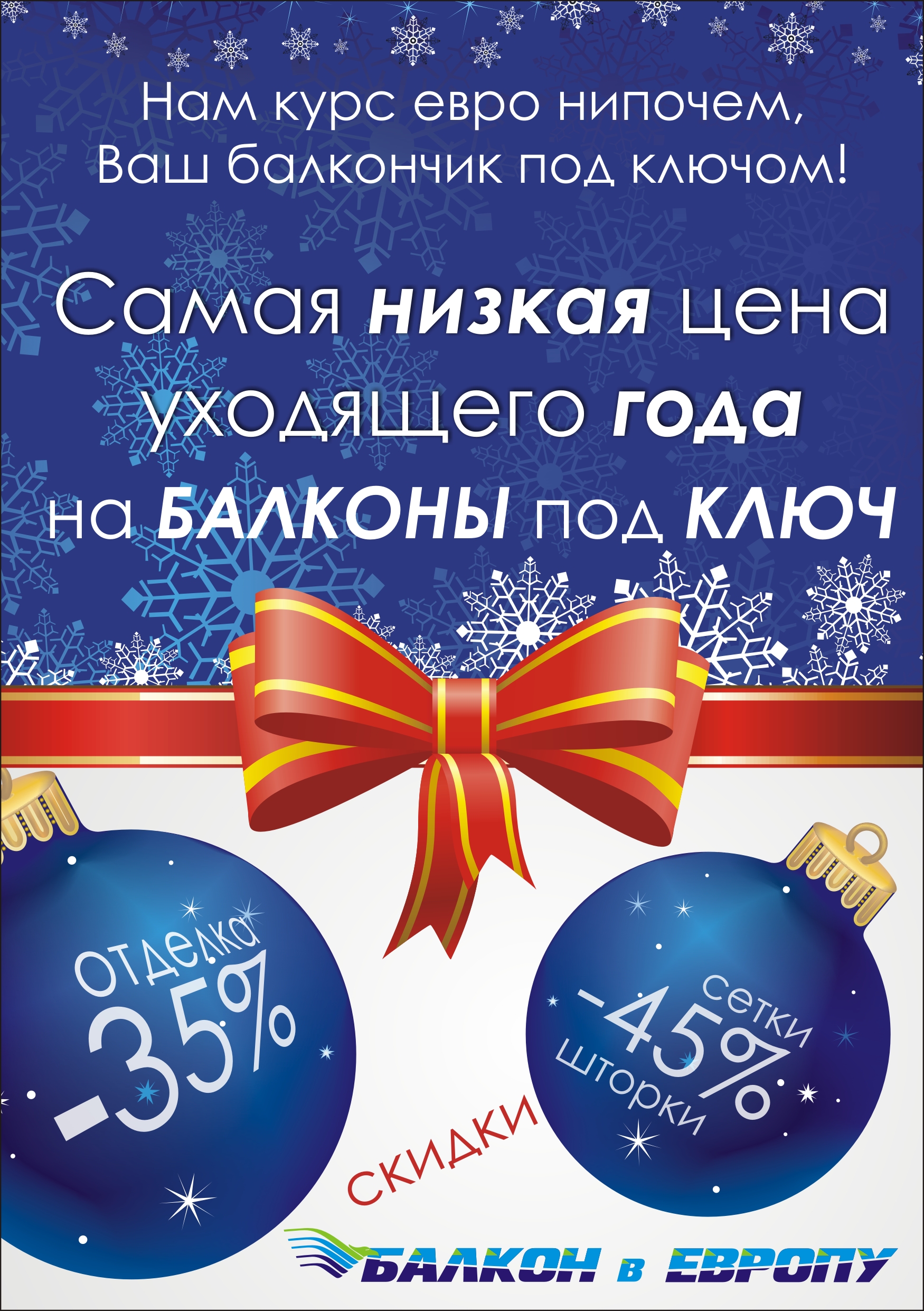 А в честь приближающегося Нового года и Рождества мы спешим порадовать наших клиентов самыми низкими ценами уходящего года! Скидки 35% на отделку, 45% - на москитные сетки и шторки! Но и это еще не все: сэкономьте до 12 000 рублей с компанией "Балкон в Европу": каждому заказавшему балкон "под ключ" мы дарим антиаллергенную москитную сетки и теплый пол! Спешите до 20 декабря!