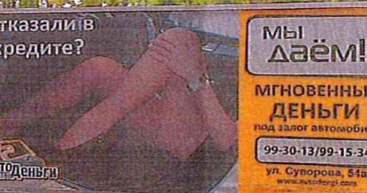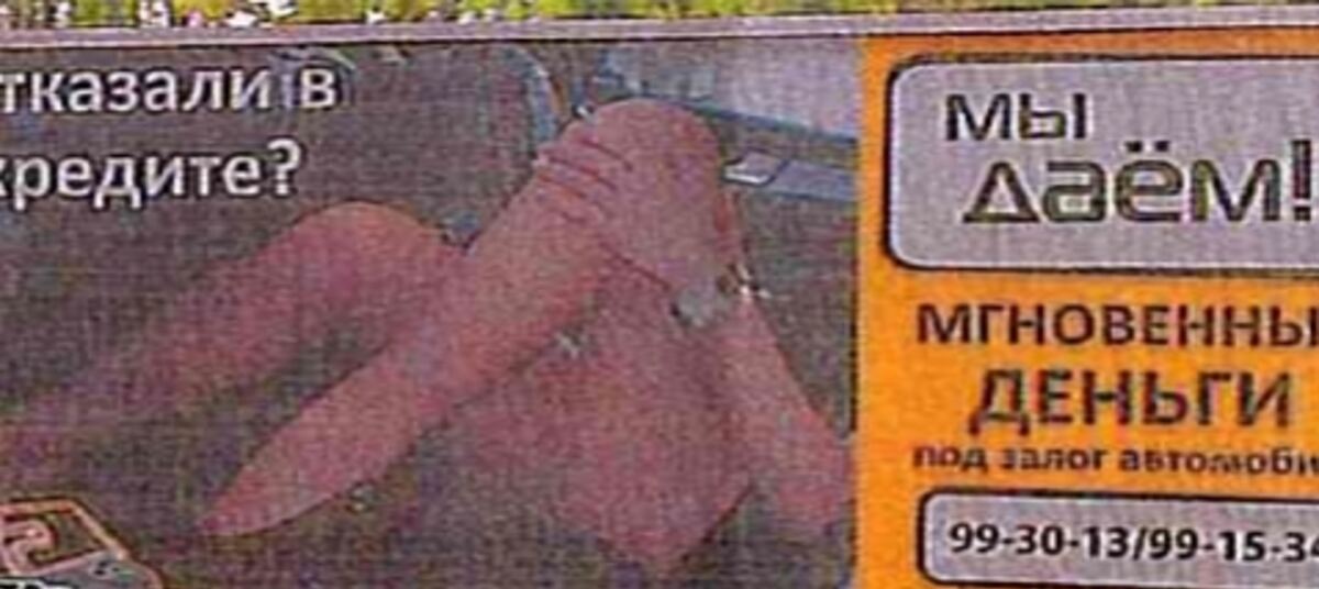 В 2013 году житель Калининграда пожаловался в УФАС на непристойную, по его мнению, рекламу банковских услуг. На рекламном щите были изображены обнаженные женские ноги и надпись "Отказали в кредите? Мы даём! Мгновенные деньги под залог автомобиля".