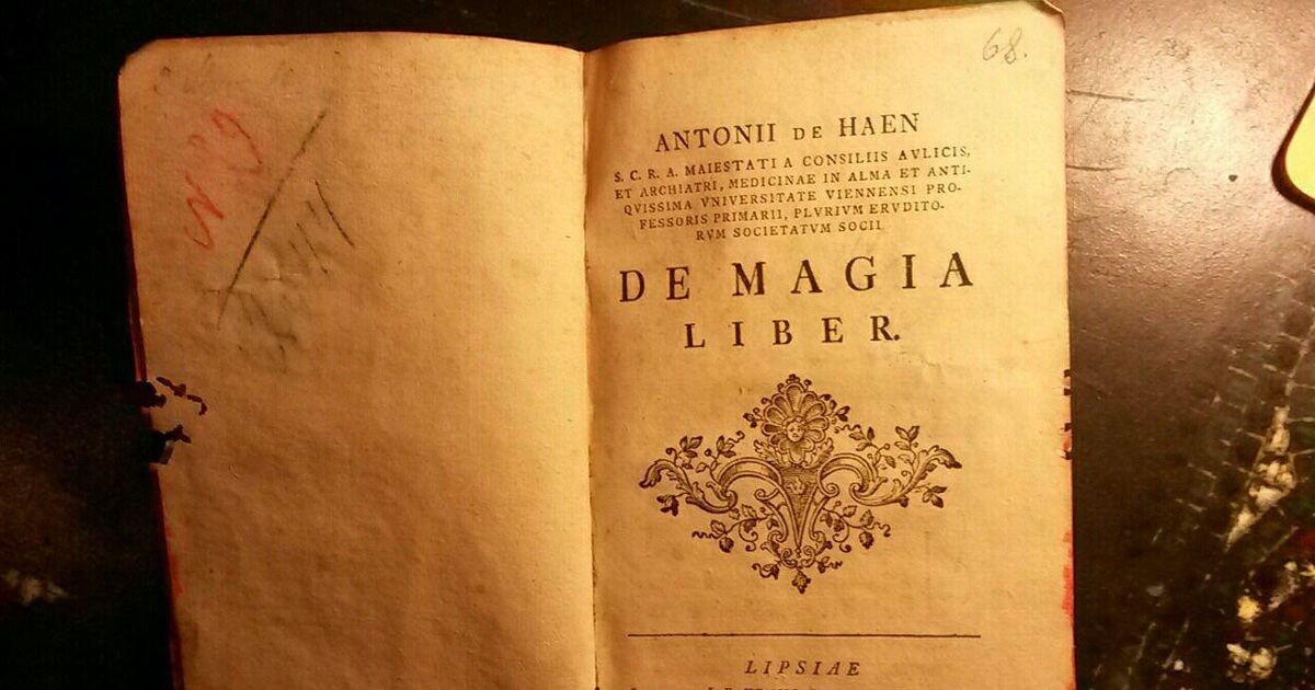 "Древняя книга по магии De Magia Liber Antoni de Haen. 316 страниц. 1774 год. Кожаный переплёт. Качество обложки — среднее. Бумага в книге в отличном состоянии", — перечисляется в объявлении.