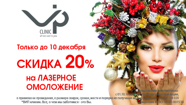 Только до 10 декабря в клинике пластической хирургии и косметологии "VIP Clinic" действует скидка 20% на услугу лазерного омоложения кожи!