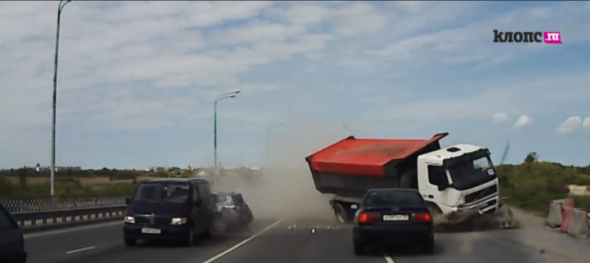Причиной крупной дорожной аварии на Берлинском мосту, которая произошла 16 мая в Калининграде, стало лопнувшее колесо у большегруза "Вольво".