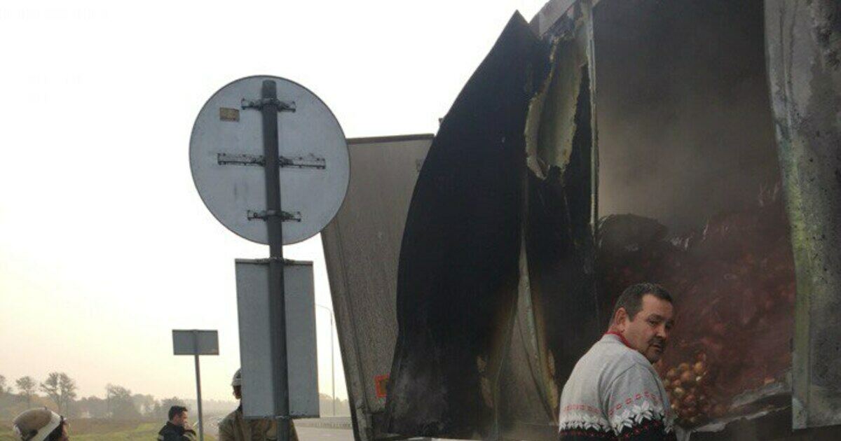 В результате аварии водитель съехал на обочину, а из кузова высыпался лук, который перевозили в грузовике в мешках. На месте работают сотрудники ДПС, пожарные потушили возгорание. Лук собрали обратно в грузовик, движение не затруднено.