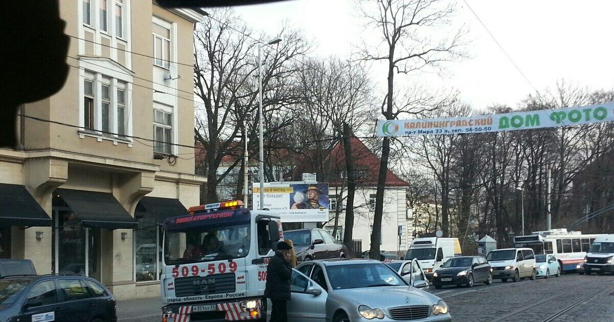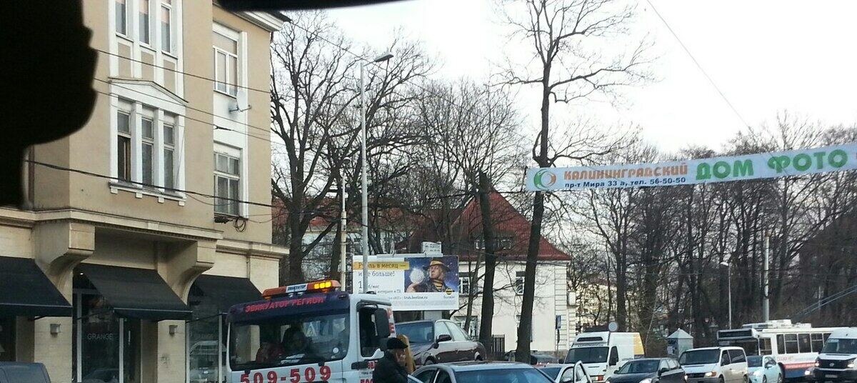 В центре Калининграда эвакуатор, везущий машину, попал в ДТП