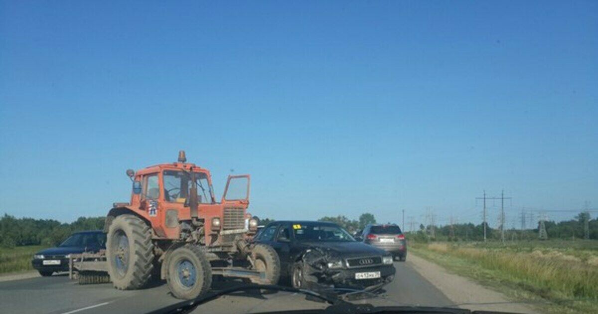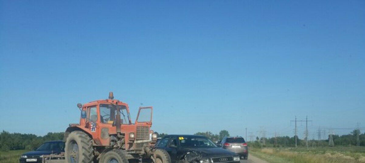 Трактор столкнулся с автомобилем на ул. Большой Окружной около 17.45, сообщают пользователи соцсетей.