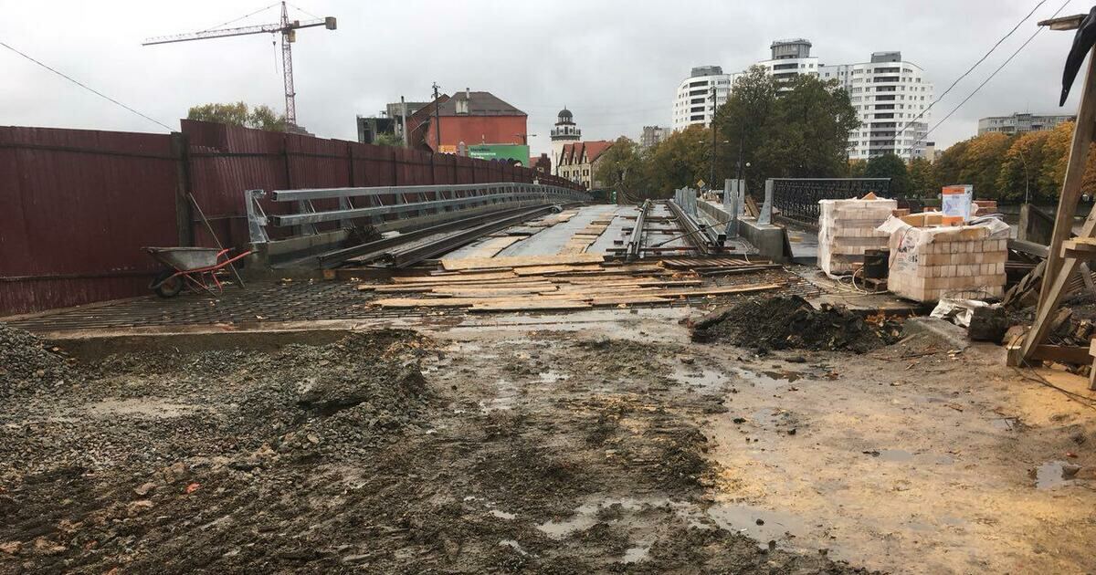 В Калининграде на ремонтируемом Деревянном мосту уложили трамвайные рельсы. Об этом сообщает корреспондент Клопс.Ru.