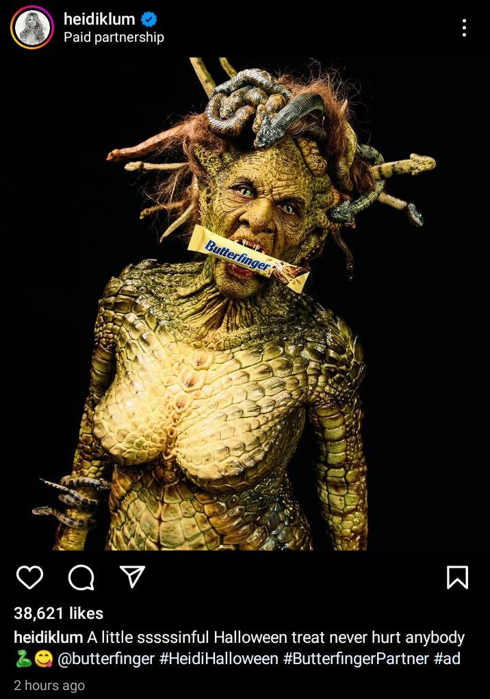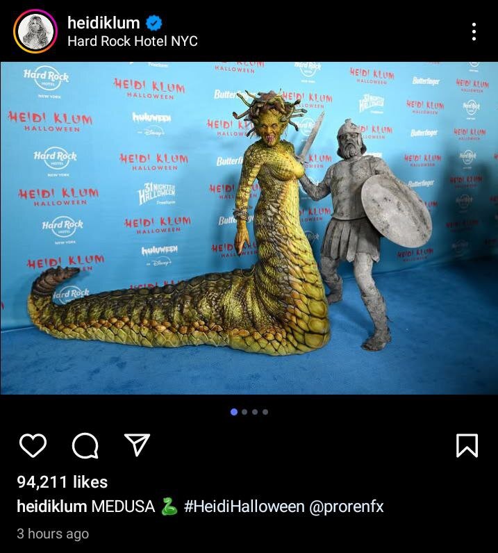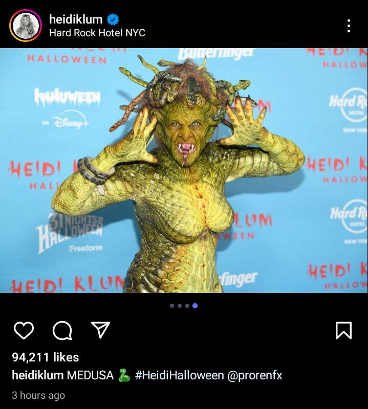 Супермодель Хайди Клум нарядилась в горгону Медузу на ежегодной вечеринке в честь Хэллоуина в Нью-Йорке. Фотографиями своего образа она похвасталась в соцсетях.