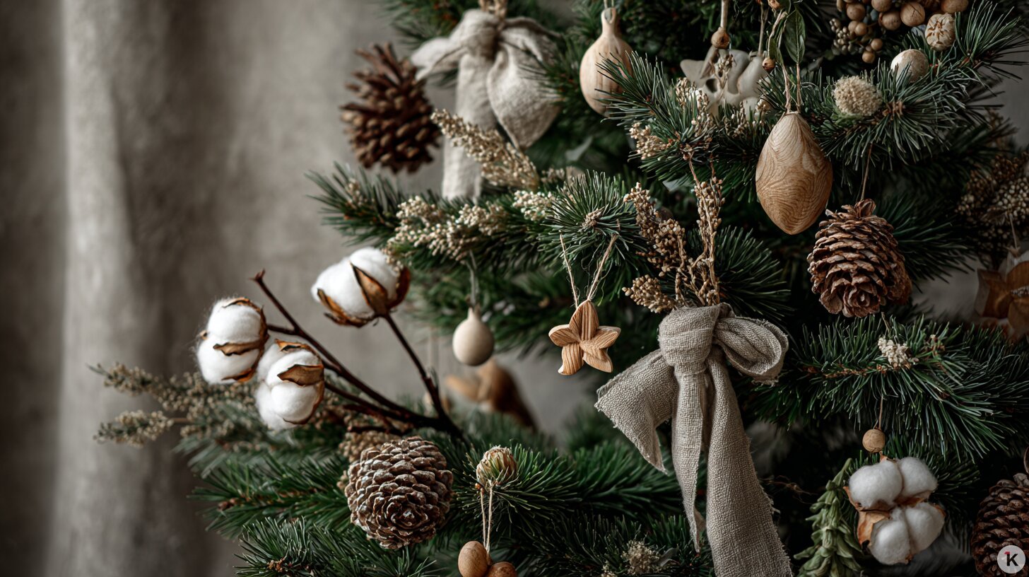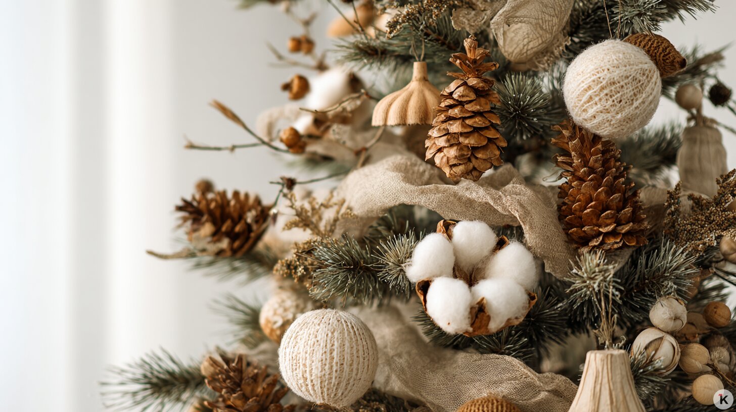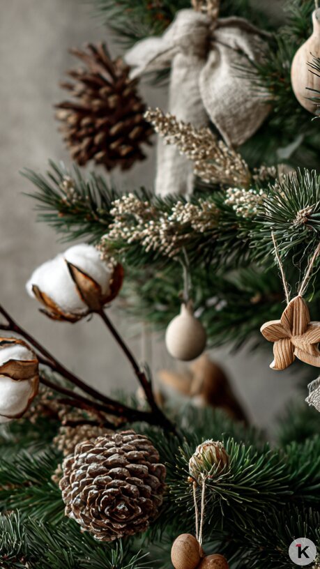 Простой и уютный дизайн из натуральных материалов, кажется, никогда не выйдет из моды. Хюгге предполагает вместо ярких украшений отсылки к природе — шишки, деревянные игрушки, льняные ленты, хлопок, сухоцветы или вязаные украшения. Сюда же вписываются золотые или белые звёзды, сердца и ангелы. В таком случае лучше использовать живое дерево.