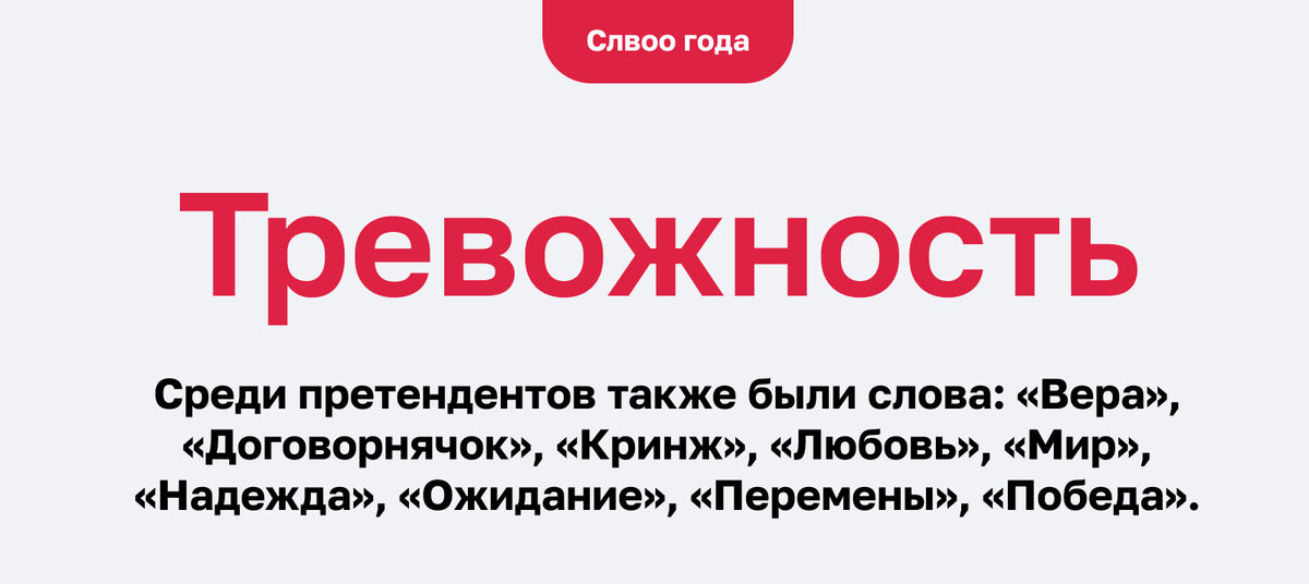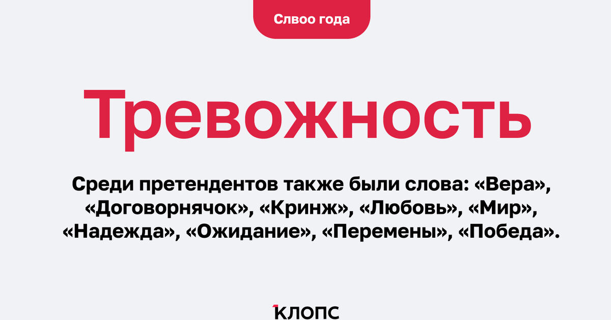 Среди претендентов также были слова: «Вера», «Договорнячок», «Кринж», «Любовь», «Мир», «Надежда», «Ожидание», «Перемены», «Победа».