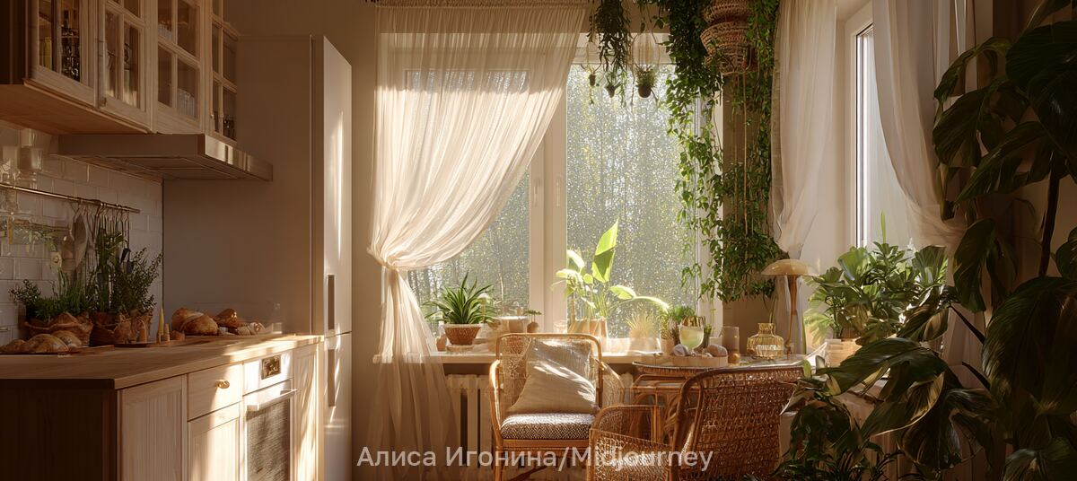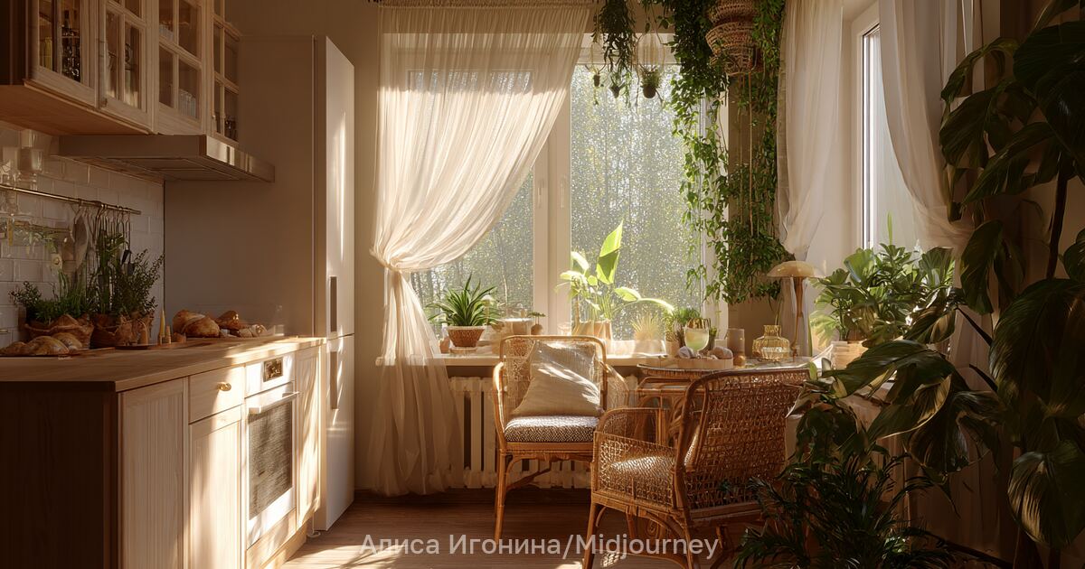 На окна лучше повесить шторы или тюль. «Выбирайте что-нибудь лёгкое. Ищите ткань, которая позволит попадать в ваш дом солнечным лучам, например, полупрозрачный лён», — советует дизайнер интерьеров Энни Даунинг. Оживить подоконник можно растениями в глиняных горшках. Это могут быть как декоративные цветы, так и полезные приправы.