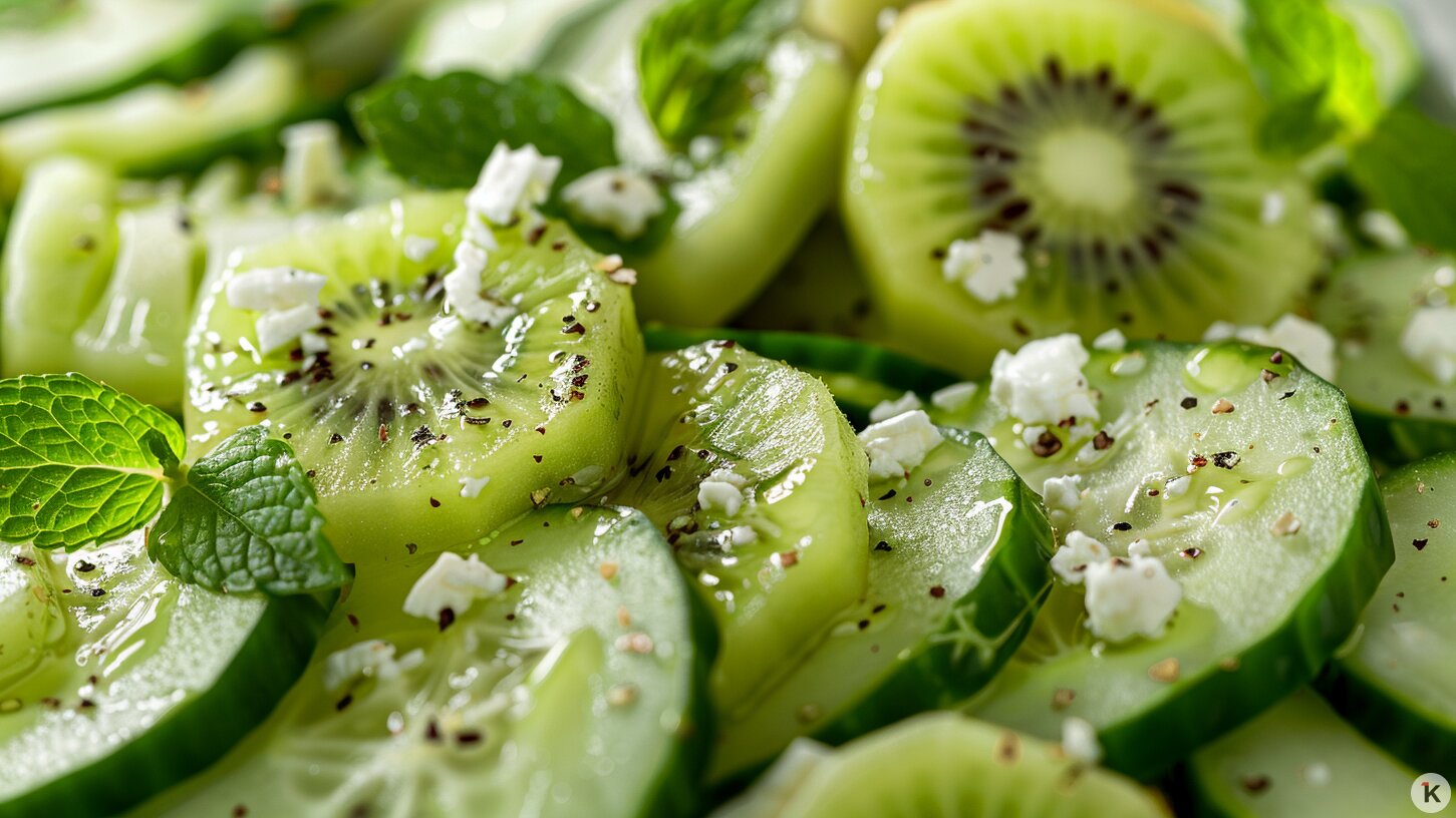 Листики мяты и петрушки, чеснок и масло измельчить в однородную пасту с помощью блендера. Огурец и киви нарезать тонкими кружочками. Выложить их на тарелку, чередуя друг с другом. Посыпать раскрошенной фетой и полить заправкой.