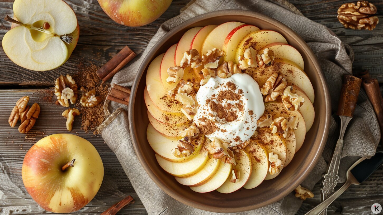 Яблоки почистить, нарезать кубиком или тонкими дольками. Выложить в миску вместе с рублеными орехами. Заправить сметаной или греческим йогуртом, а затем присыпать корицей.