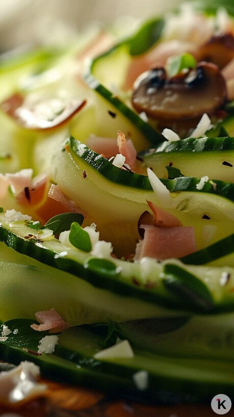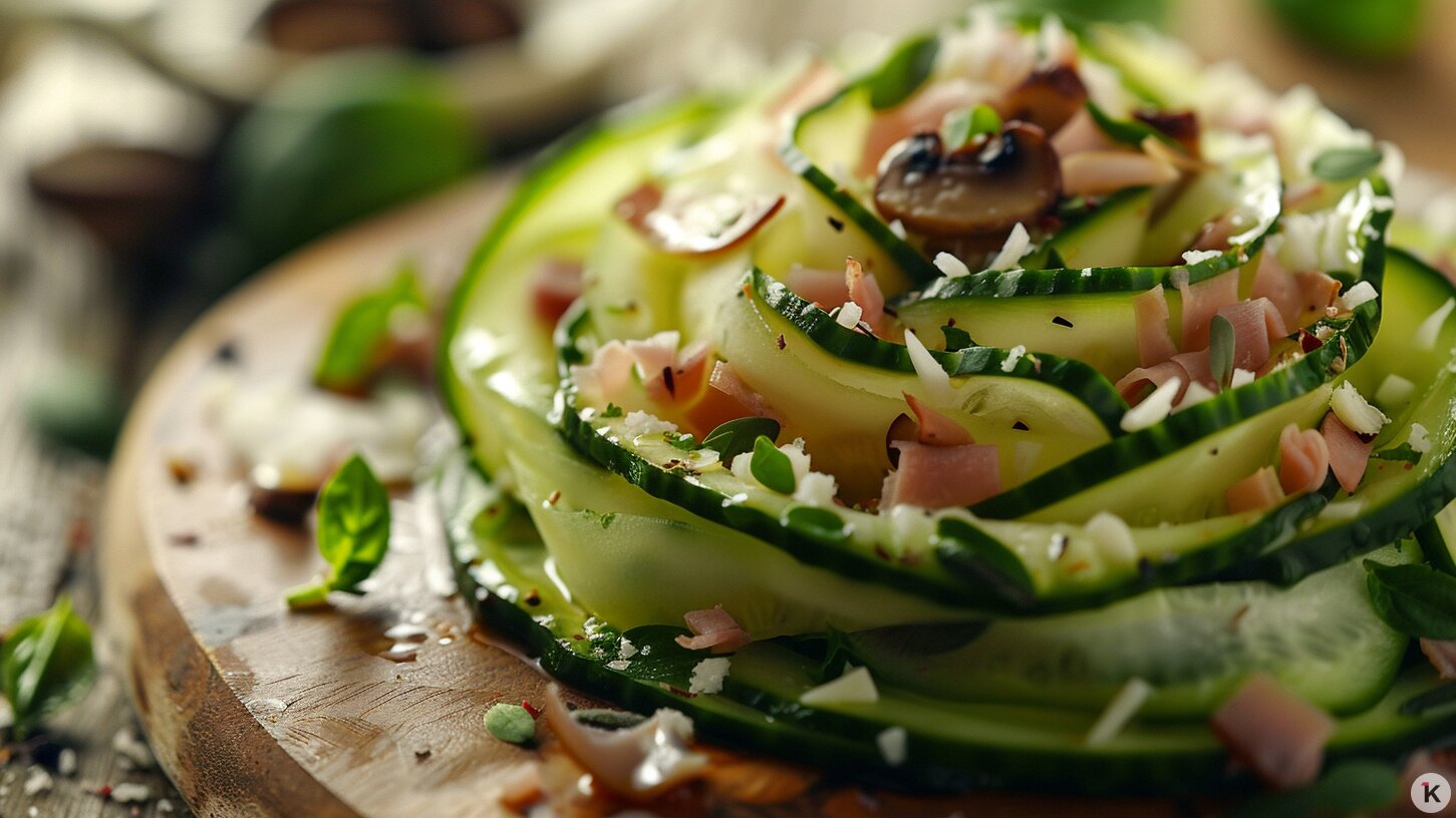 Огурцы нарезать тонкими полосками с помощью ножа или овощечистки. Приложить слайсы в краю миски, выкладывая начинку таким образом, чтобы слои обрели форму большой розы.