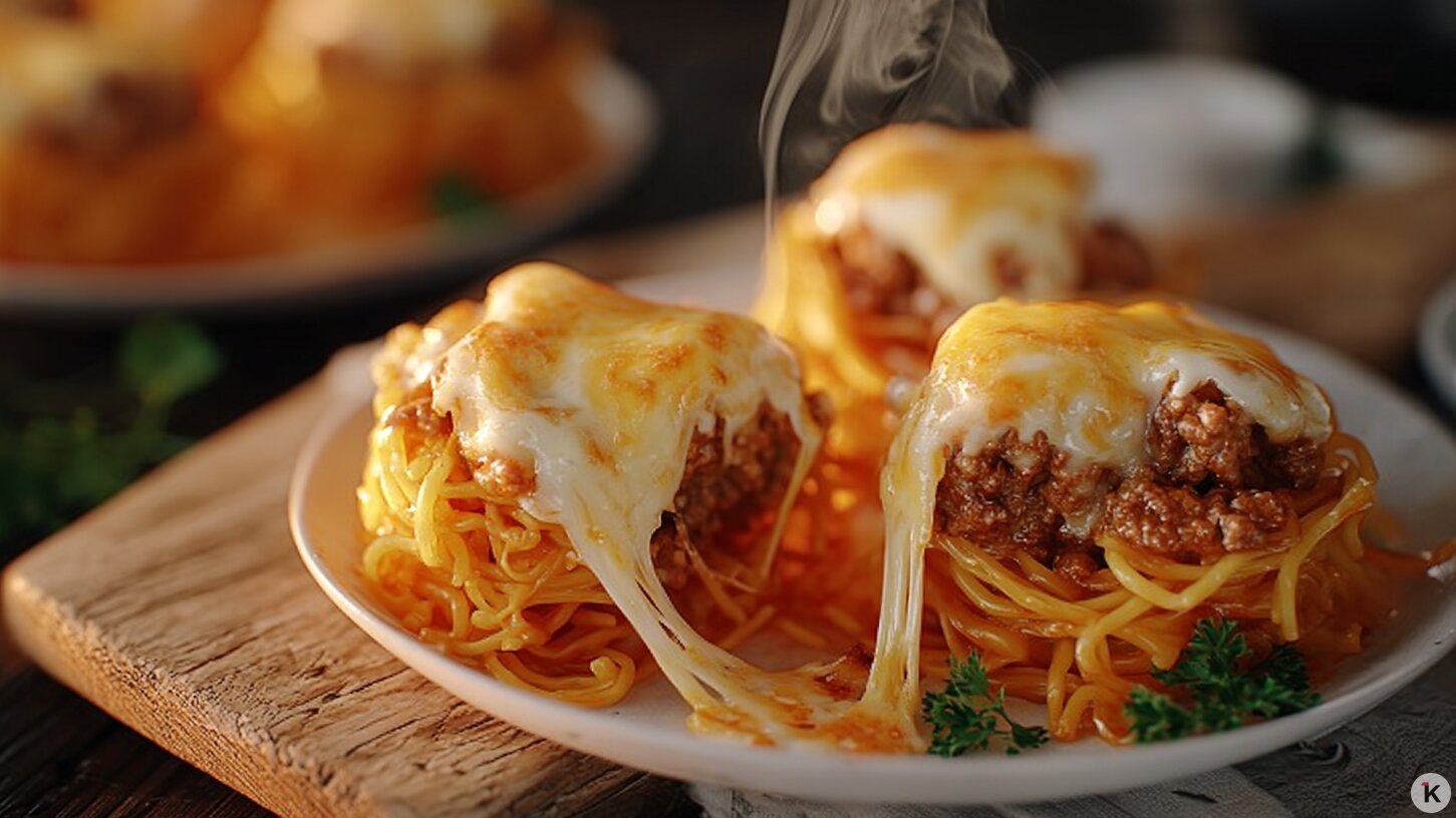 Разместить воронки из макарон в смазанной маслом форме для запекания. В каждое углубление положить фарш, сверху посыпать тёртым сыром, а всю форму залить томатным соусом. Запекать при 180 °С в течение 45-50 минут.
