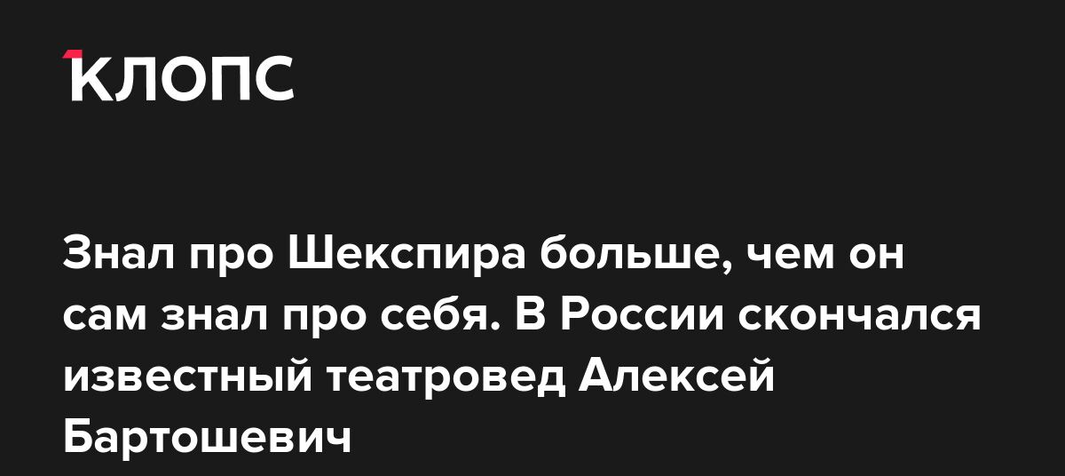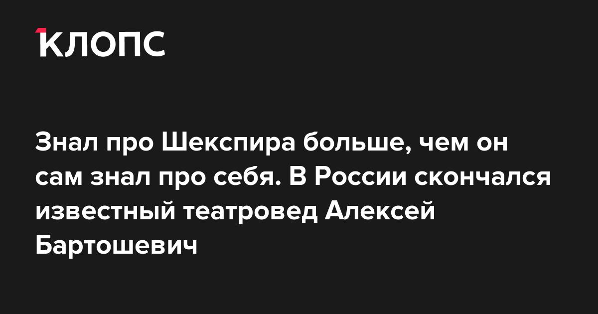 В России скончался выдающийся российский театровед и популяризатор театра, крупнейший шекспировед и заведующий кафедрой зарубежного театра Российской академии театрального искусства Алексей Бартошевич. Об этом пишет «Коммерсант» в четверг, 9 октября.