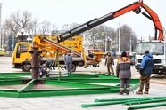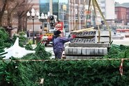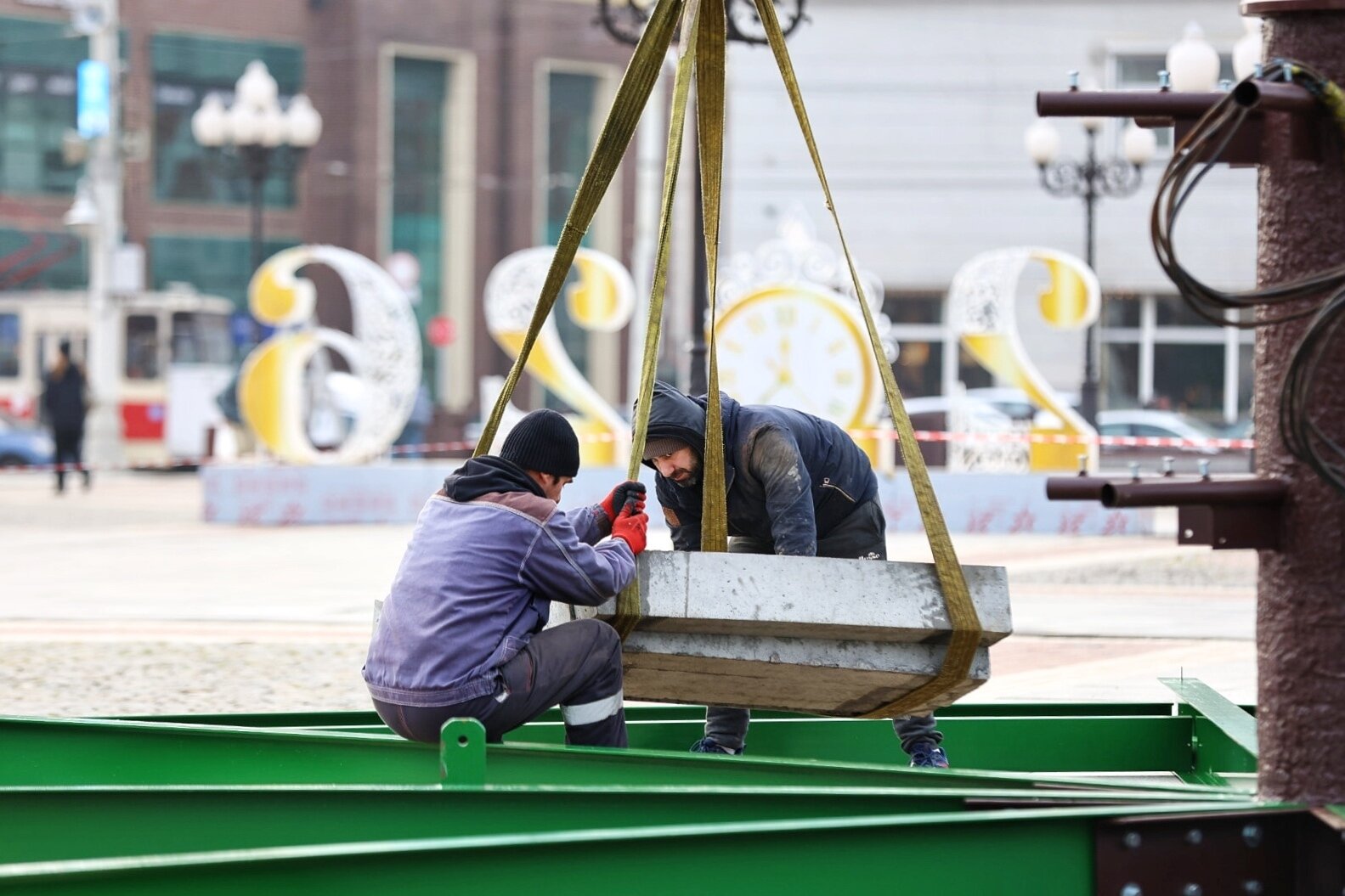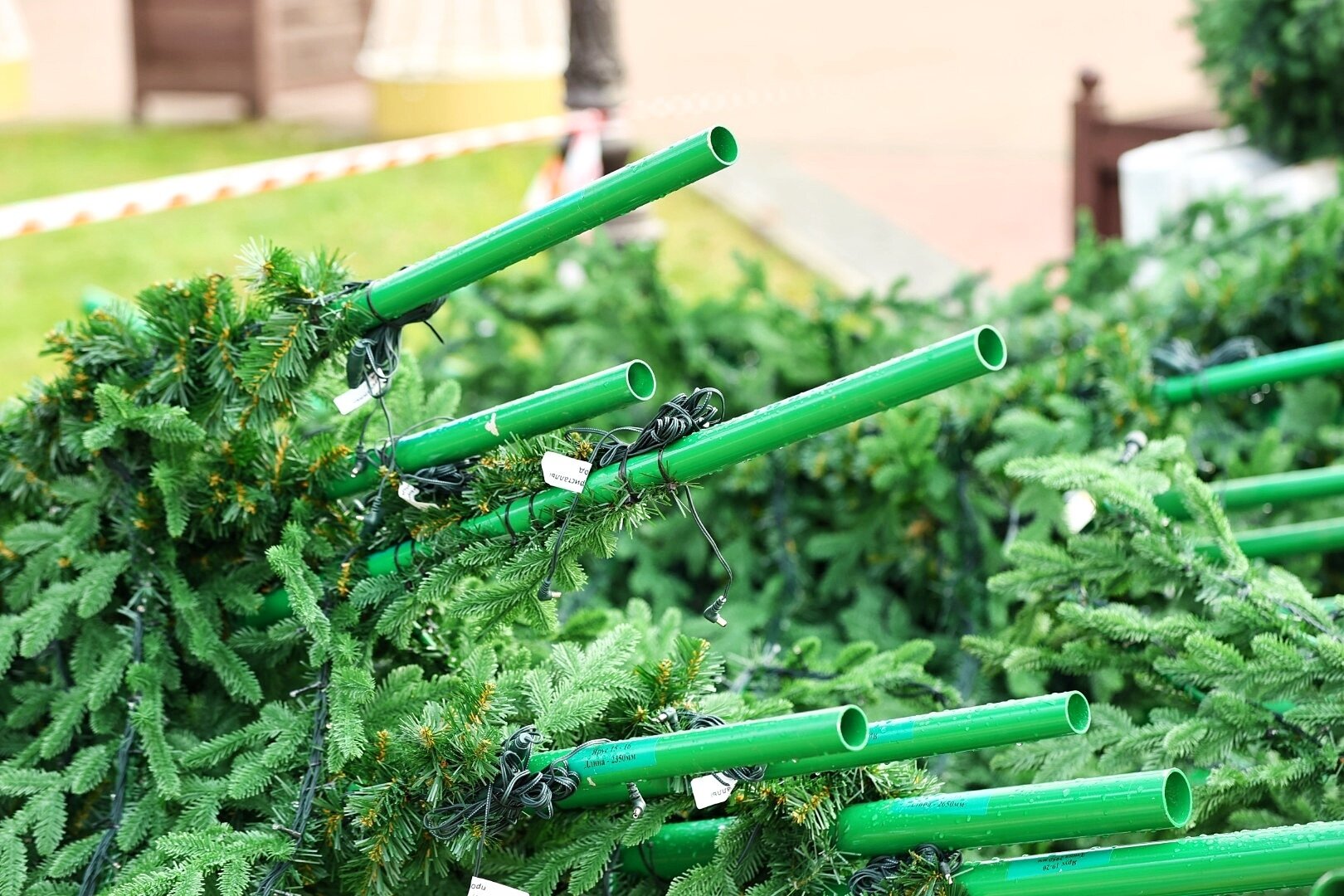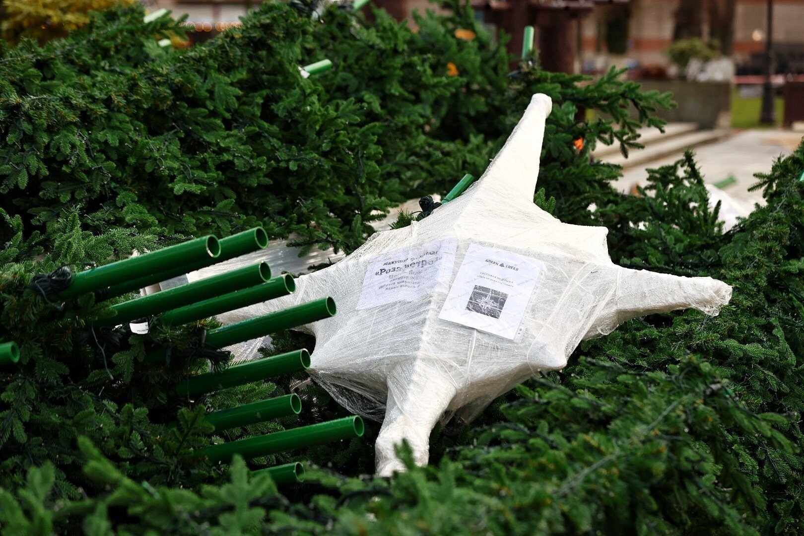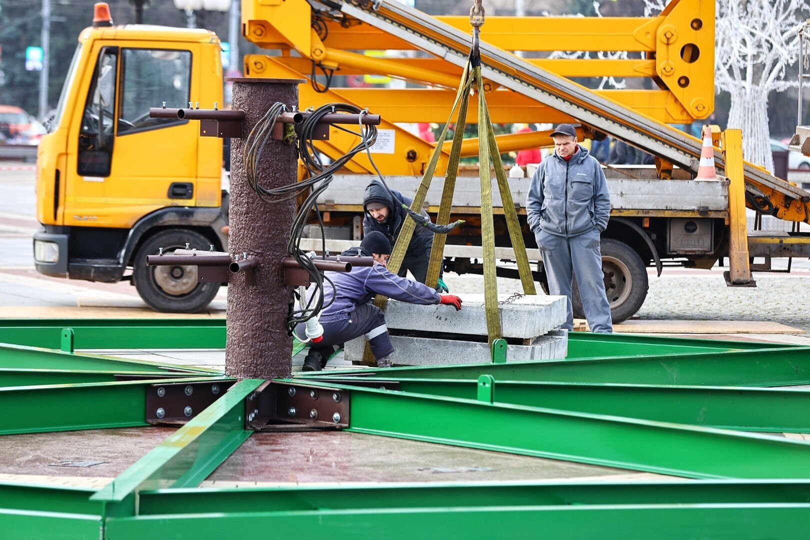 Проход в центре площади частично перекрыт. Конструкция выглядит необычно: каждая ветвь оснащена встроенными фонариками. Когда дерево будет полностью собрано и украшено, огоньки зажгут автоматически. Рабочие сообщили, что на монтаж уйдёт несколько дней.