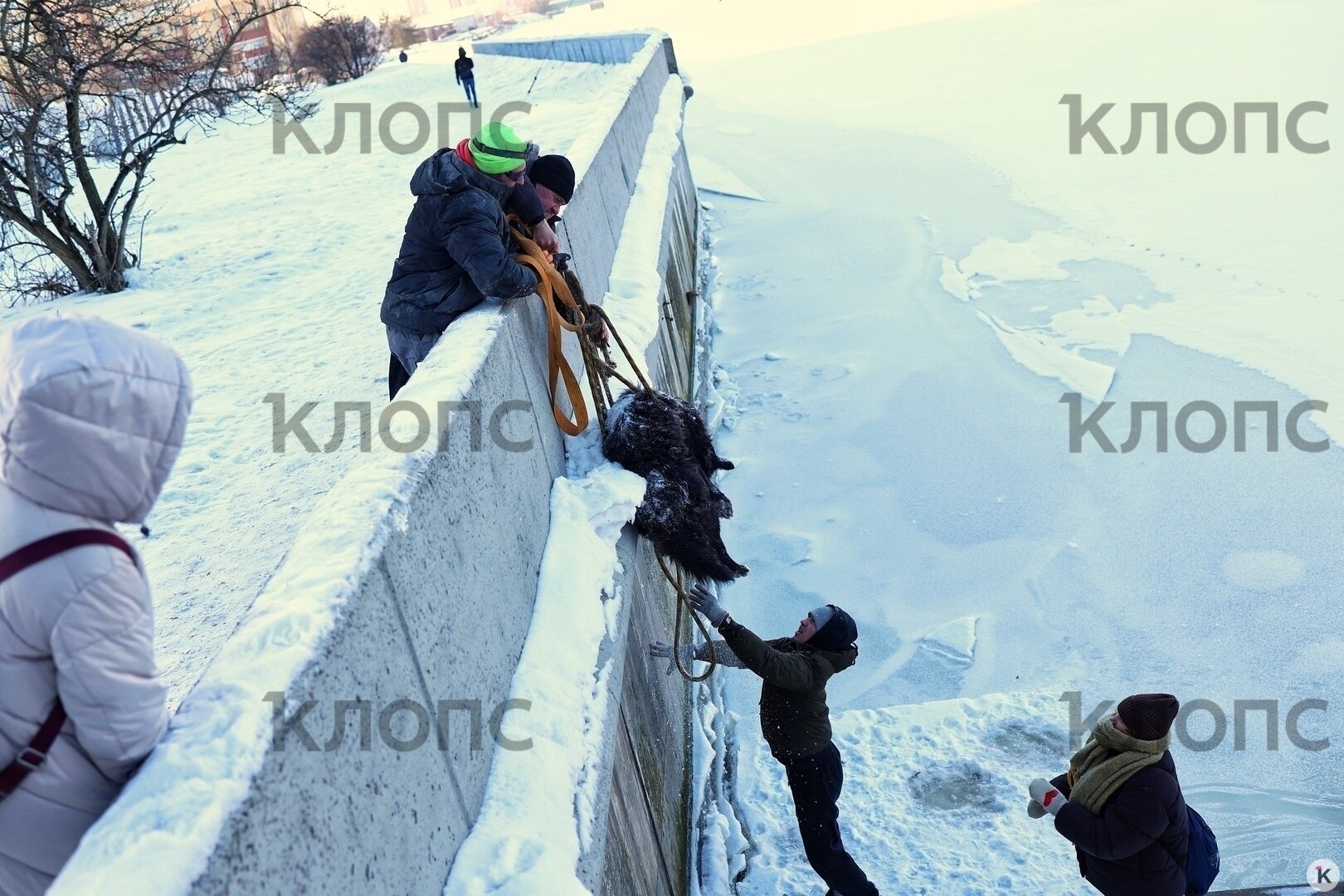 Туристка только приехала в Калининград. В понедельник, 9 февраля, прогуливалась по набережной Преголи в районе Музея изобразительных искусств на Ленинском проспекте, 83. Глянула вниз — и увидела на льду реки свернувшуюся калачиком чёрную собаку. Рядом — бетонные отвесные стены, до парапета несколько метров.