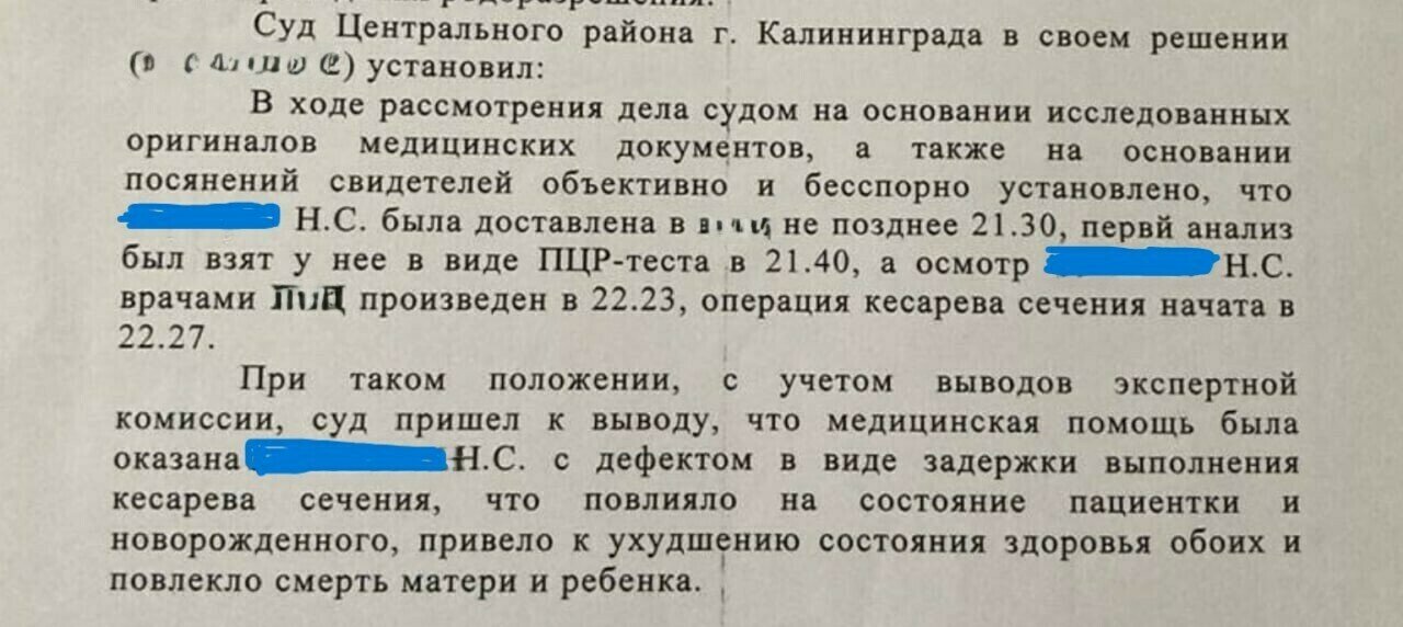 Принимая решение, суд основывался на заключении судебной экспертизы. Она установила, что медпомощь Наталье была оказана «с дефектом в виде задержки выполнения кесарева сечения, что повлияло на состояние пациентки и новорождённого, привело к ухудшению состояния здоровья обоих и повлекло смерть матери и ребёнка».
