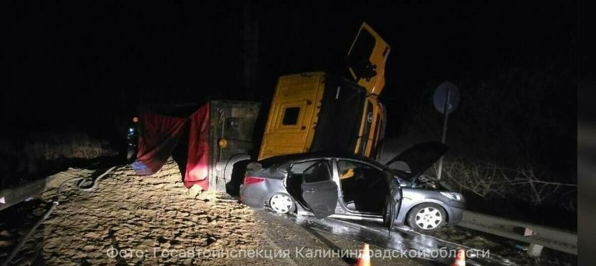 В Зеленоградском районе песковоз, уходя от аварии, опрокинулся и подмял под себя легковушку - Новости Калининграда | Фото: Госавтоинспекция Калининградской области