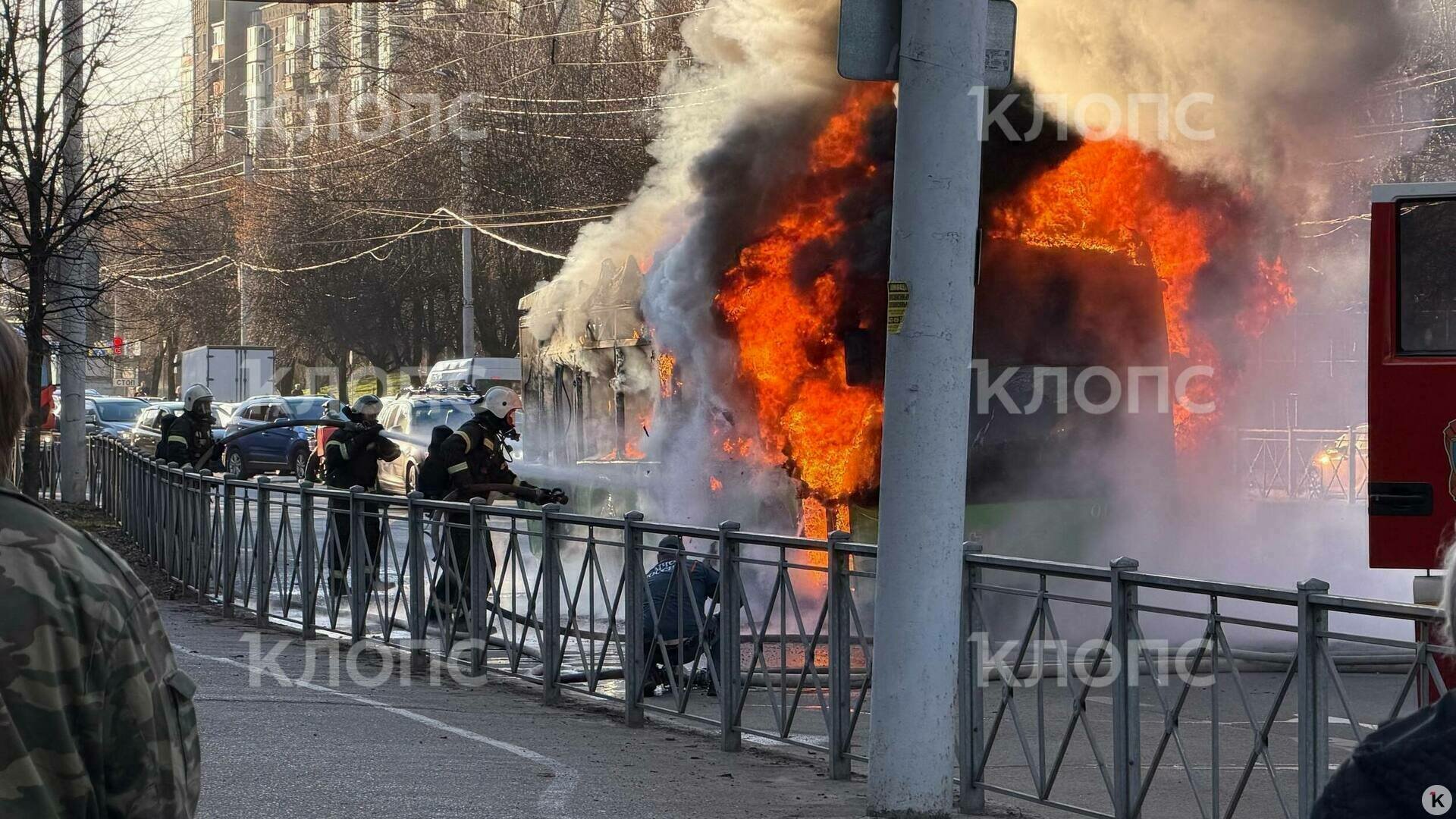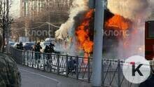 Троллейбус загорелся на дороге у бизнес-центра на Московском проспекте. К моменту прибытия экстренных служб транспорт был полностью охвачен огнём, на месте работали пожарные.