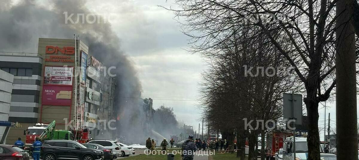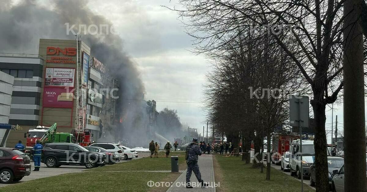 Пламя вырывается наружу сразу в нескольких местах торгового центра «Гиант». К месту пожара стянули почти все городские расчёты. Возле полыхающего комплекса стоят как минимум четыре машины скорой помощи. Снаружи собралась толпа зевак, территорию оцепили лентой.