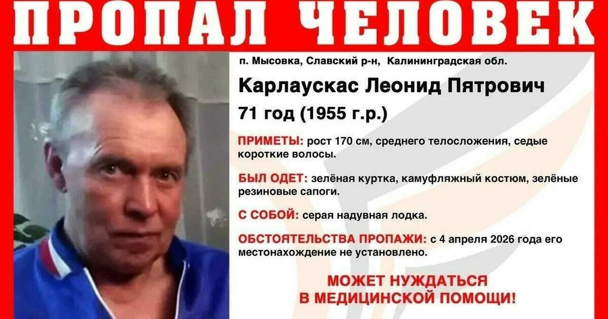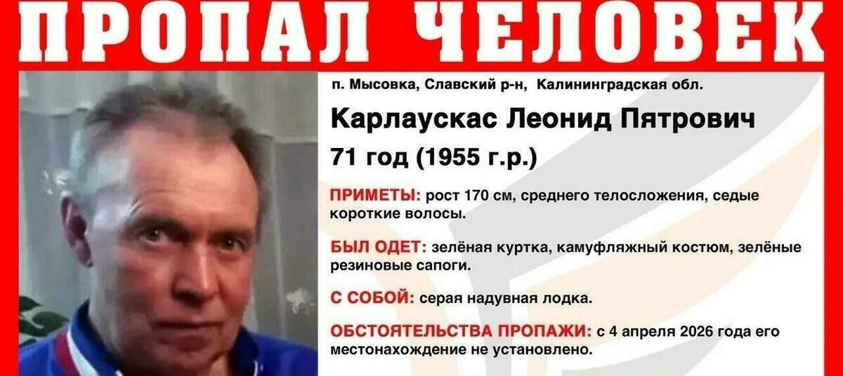 В Славском районе ищут 71-летнего Леонида Карлаускаса, который пропал 4 апреля. Мужчина может нуждаться в медицинской помощи. Последний раз пенсионера видели в пос. Мысовка с серой надувной лодкой.