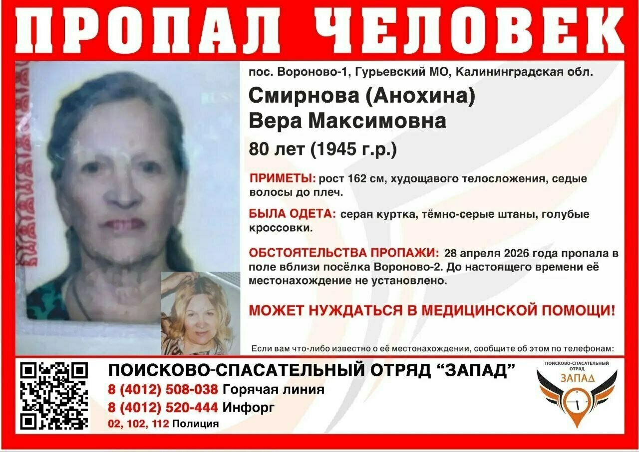 В Калининградской области ищут 80-летнюю Веру Смирнову, которая пропала сутки назад. Об этом сообщает ПСО «Запад».