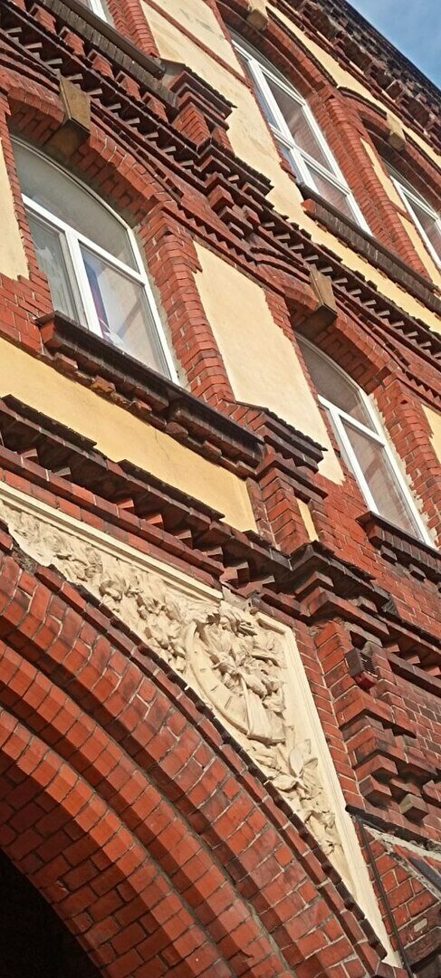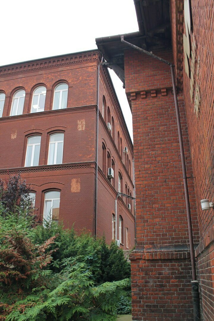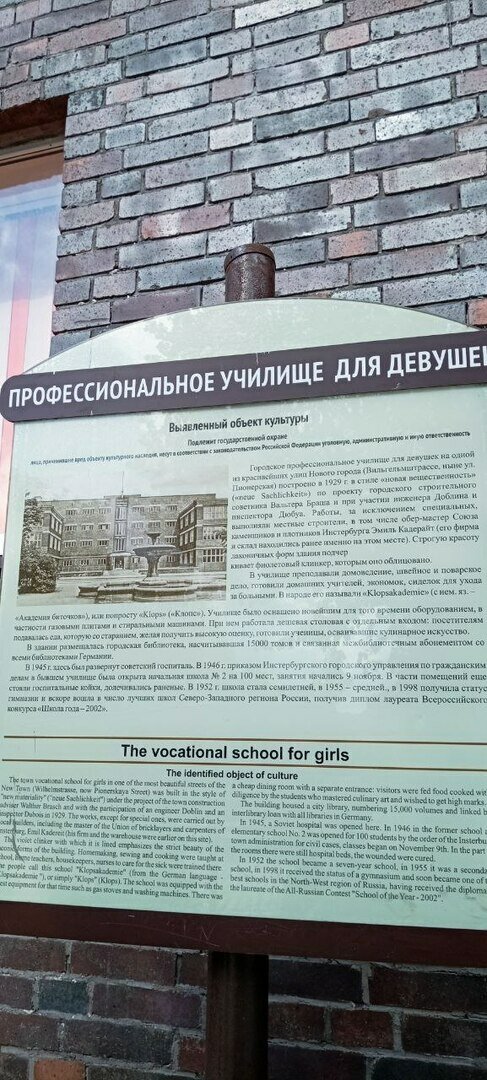 Здание 1929 года из клинкерного кирпича в стиле «новая вещественность» предназначалось под Восточно-Прусскую ремесленную школу для девушек. Юным немкам преподавали швейное и поварское дело, готовили домашних учителей, экономок и сиделок для ухода за больными.