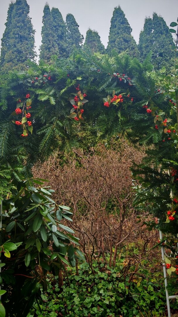 Арку и калитку декорировали ветками можжевельника, а чтобы оживить тёмно-зелёную гамму, добавили веток кизильника с алыми круглыми ягодками.